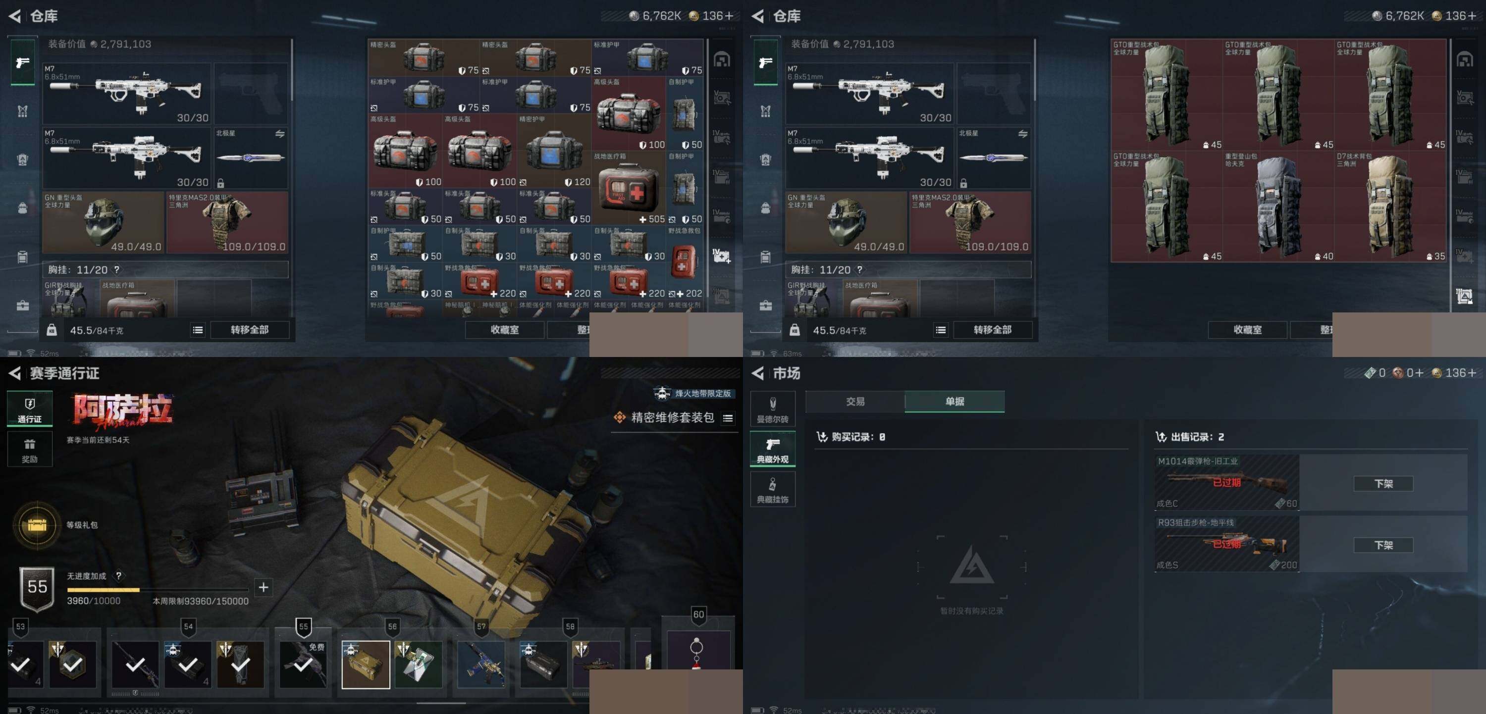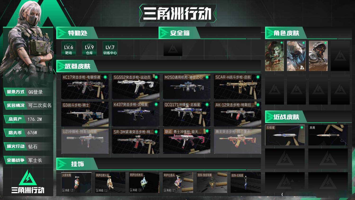 电锯惊魂红狼全套+北极星全套+捞点薯条全套 烽火地带段位: 钻石 全面战场段位: 军士长 总资产: 176000000 哈夫币: 6762000 sjs5710 传说武器皮肤: 近战-北极星,K437突击步枪-北极星,QCQ171冲锋枪-北极星,725双管霰弹枪-送葬人-无题密令,M4A1突击步枪-阿米娅,CAR-15突击步枪-阿米娅,复合弓-黑-天际线,AWM狙击步枪-捞点薯条,腾龙突击步枪-捞点薯条,93R-捞点薯条,AK-12突击步枪-特斯拉线圈,SR-3M紧凑突击步枪-特斯拉线圈,UZI