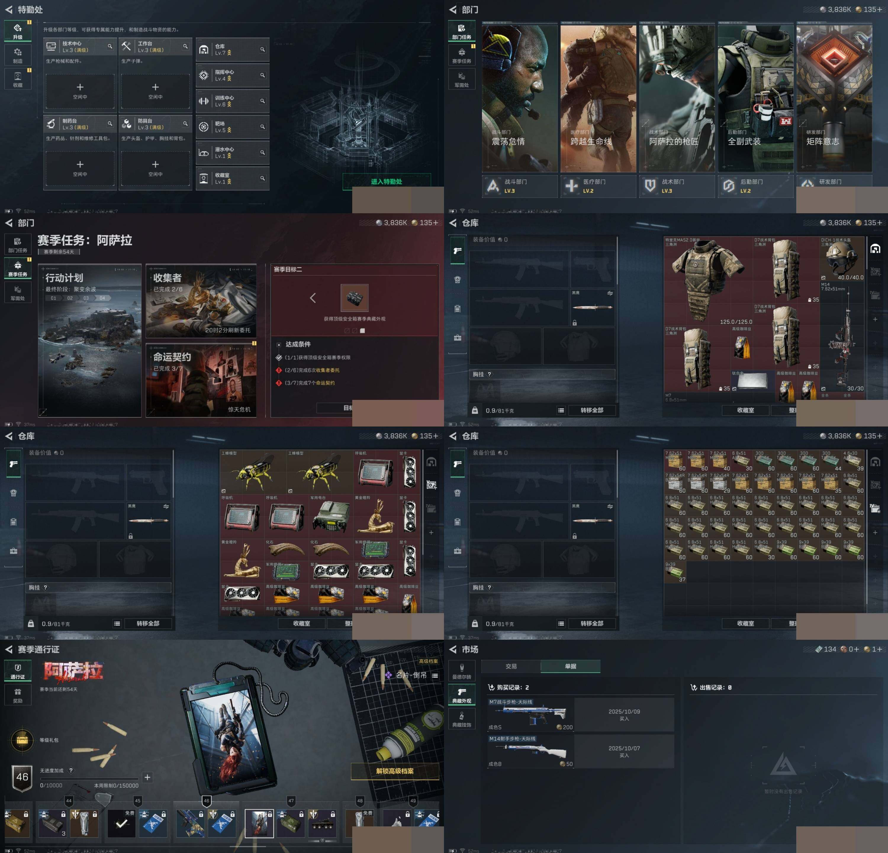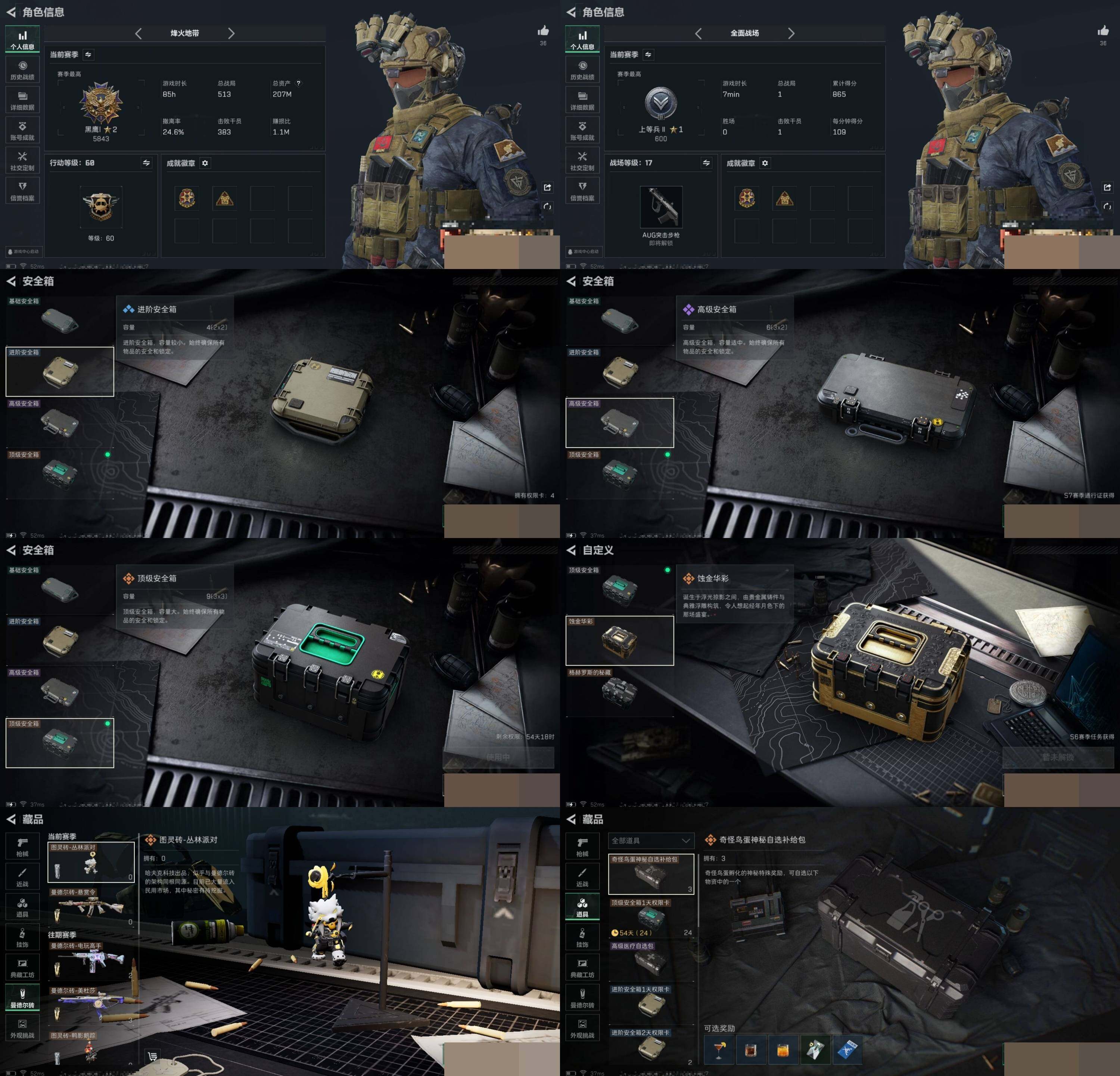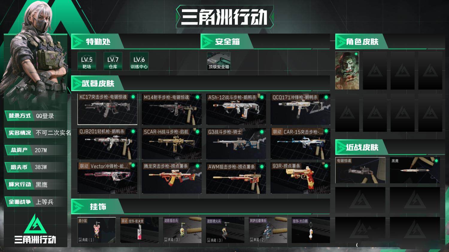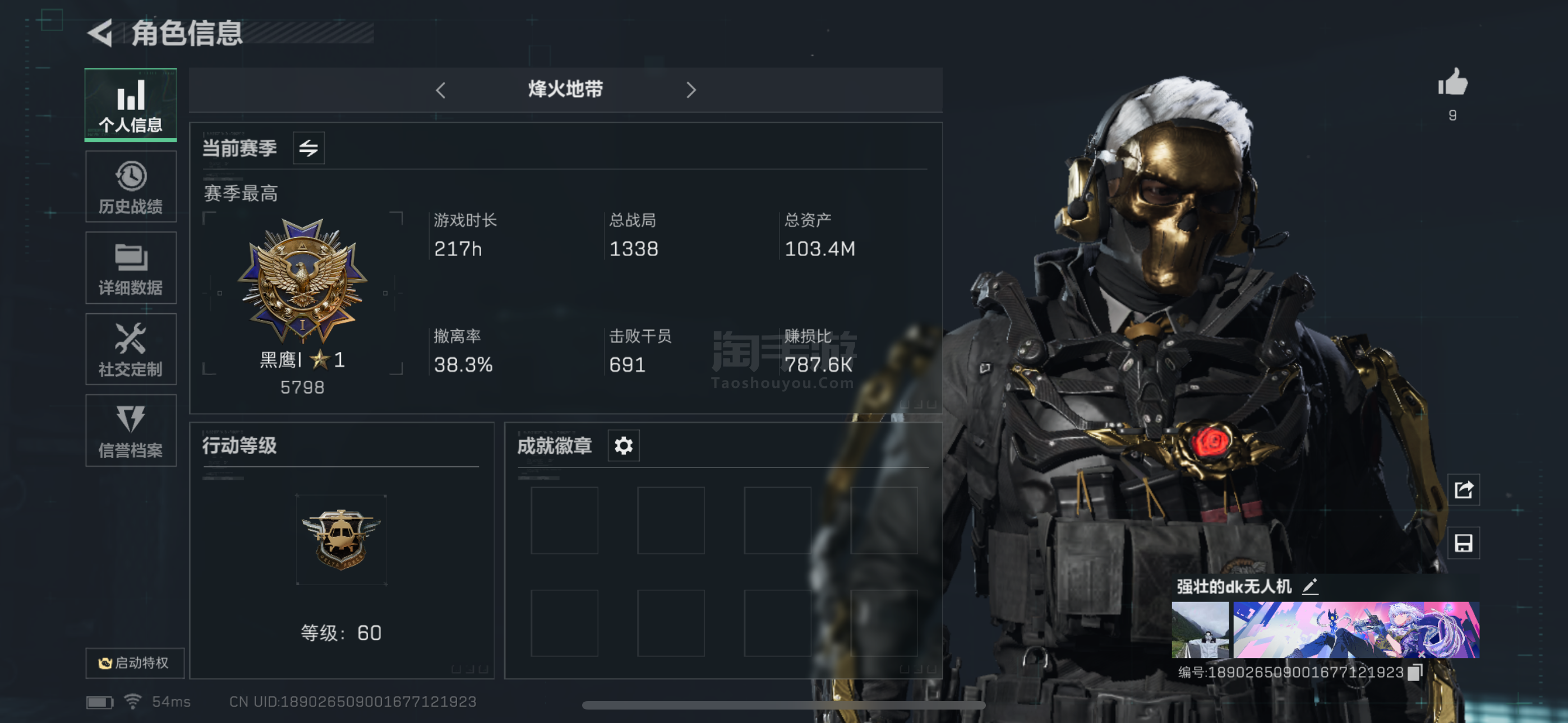 207.3m+等级60+训练6靶场5+红狼金皮 烽火地带段位: 黑鹰 全面战场段位: 上等兵 总资产: 207000000 哈夫币: 3836000