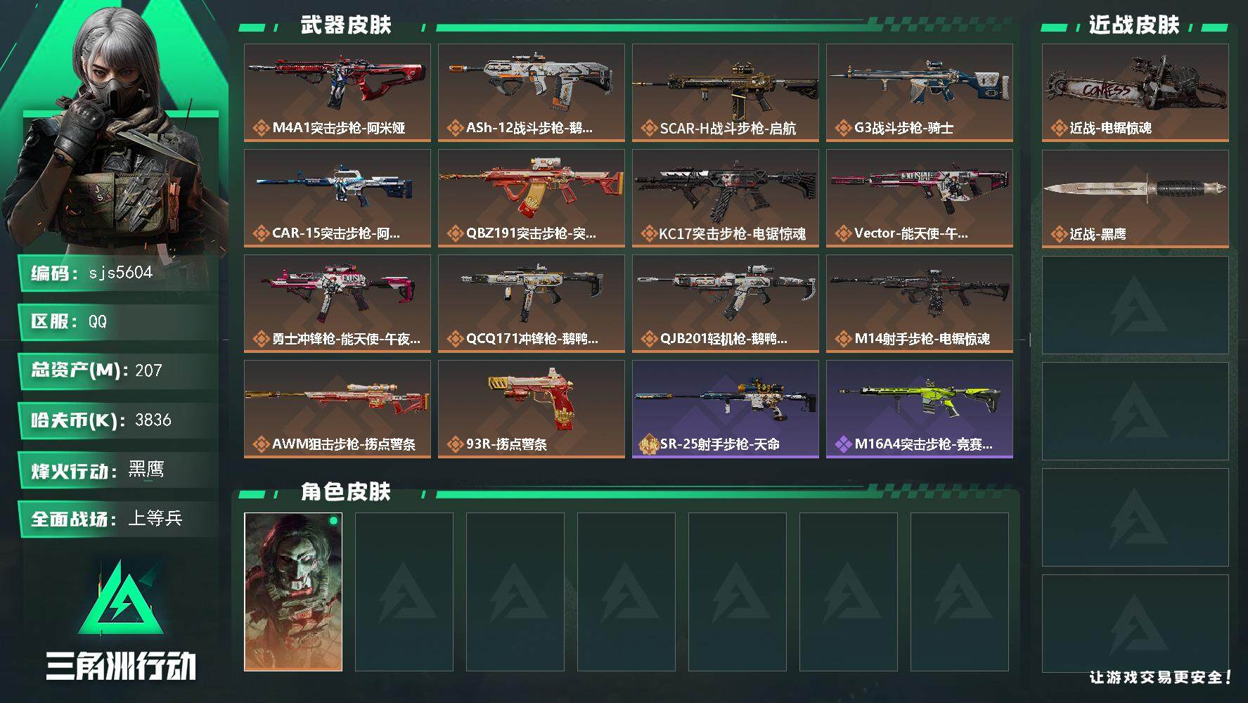 207.3m+等级60+训练6靶场5+红狼金皮 烽火地带段位: 黑鹰 全面战场段位: 上等兵 总资产: 207000000 哈夫币: 3836000 sjs5604 传说武器皮肤: M4A1突击步枪-阿米娅,CAR-15突击步枪-阿米娅,AWM狙击步枪-捞点薯条,腾龙突击步枪-捞点薯条,93R-捞点薯条,勇士冲锋枪-能天使-午夜邮差,Vector冲锋枪-能天使-午夜邮差,近战-电锯惊魂,M14射手步枪-电锯惊魂,SCAR-H战斗步枪-启航,ASh-12战斗步枪-鹅鸭杀,QCQ171冲锋枪-鹅鸭杀