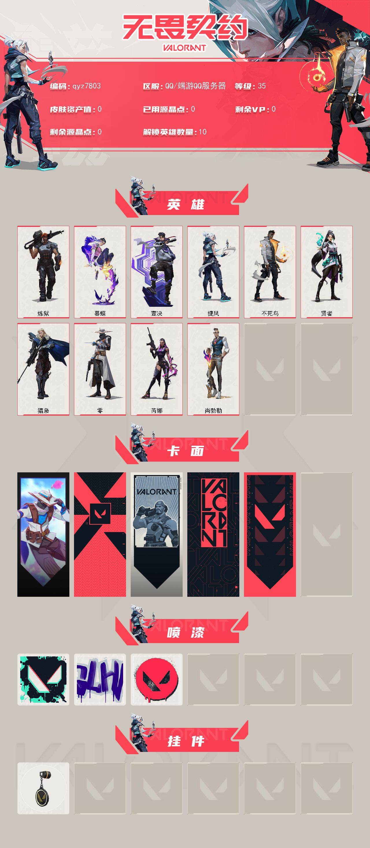 皮肤*1/等级*32/段位:黄金/炼狱/暮蝶/壹决/捷风/不死鸟/贤者/猎枭/零/芮娜/尚勃勒/无畏契约GO!第一卷:零 卡面/代号红色 卡面/新兵报到 卡面/V契约 卡面/无畏契约 卡面/胜利属于无畏契约 喷漆/GLHF 喷漆/无畏契约 喷漆/无畏契约 纪念币 挂饰 qyz7803 亮点: 【qyz7803】【英雄】:炼狱,暮蝶,壹决,捷风,不死鸟,贤者,猎枭,零,芮娜,尚勃勒【卡面】:无畏契约GO!第一卷:零 卡面,代号红色 卡面,新兵报到 卡面,V契约 卡面,无畏契约 卡面【喷漆】:胜利