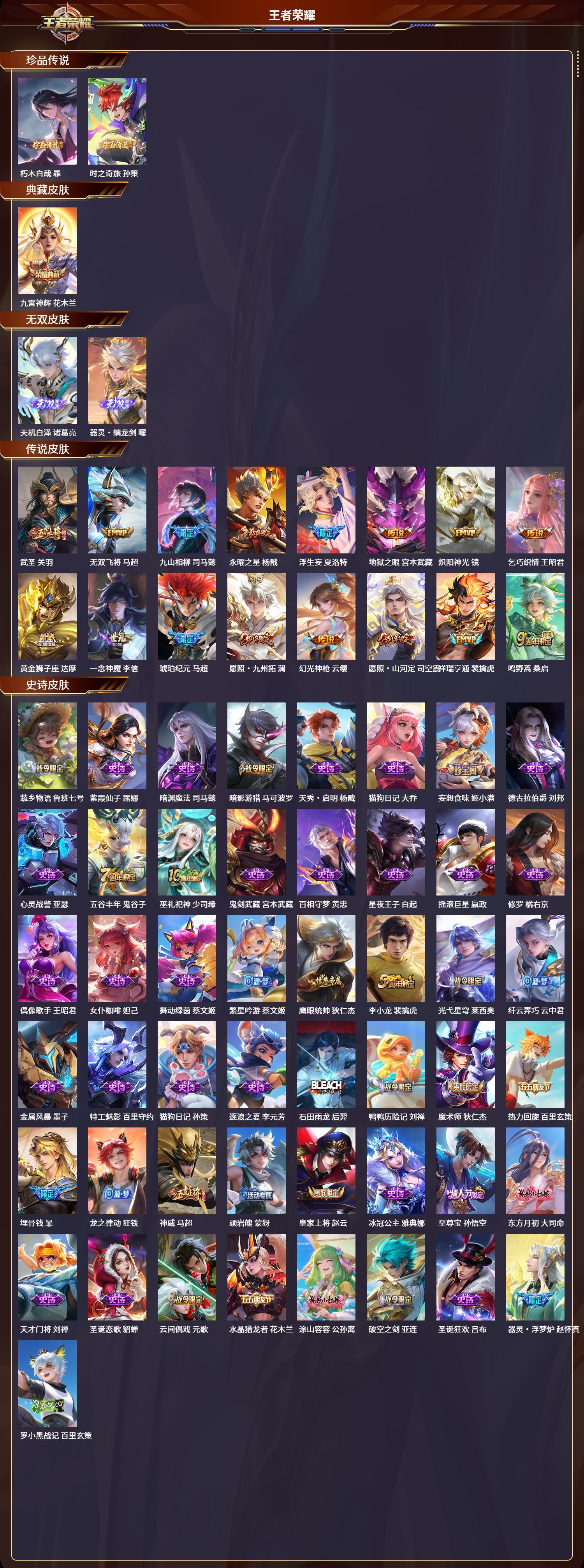 苹果QQ/绝世王者/209皮肤/126英雄/1典藏/0珍品无双/2无双/2珍品传说/16传说/65史