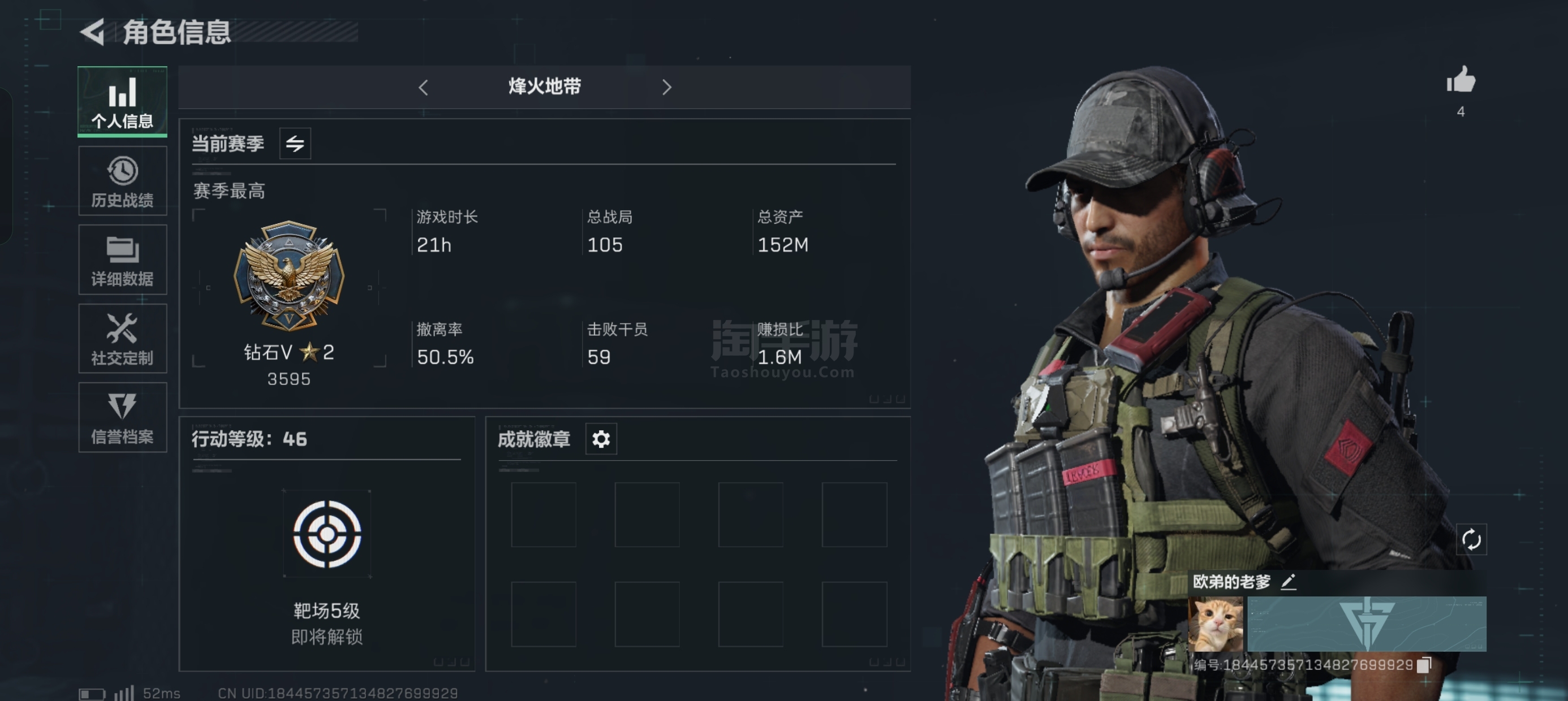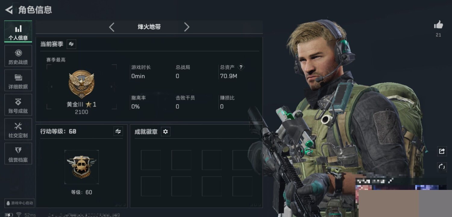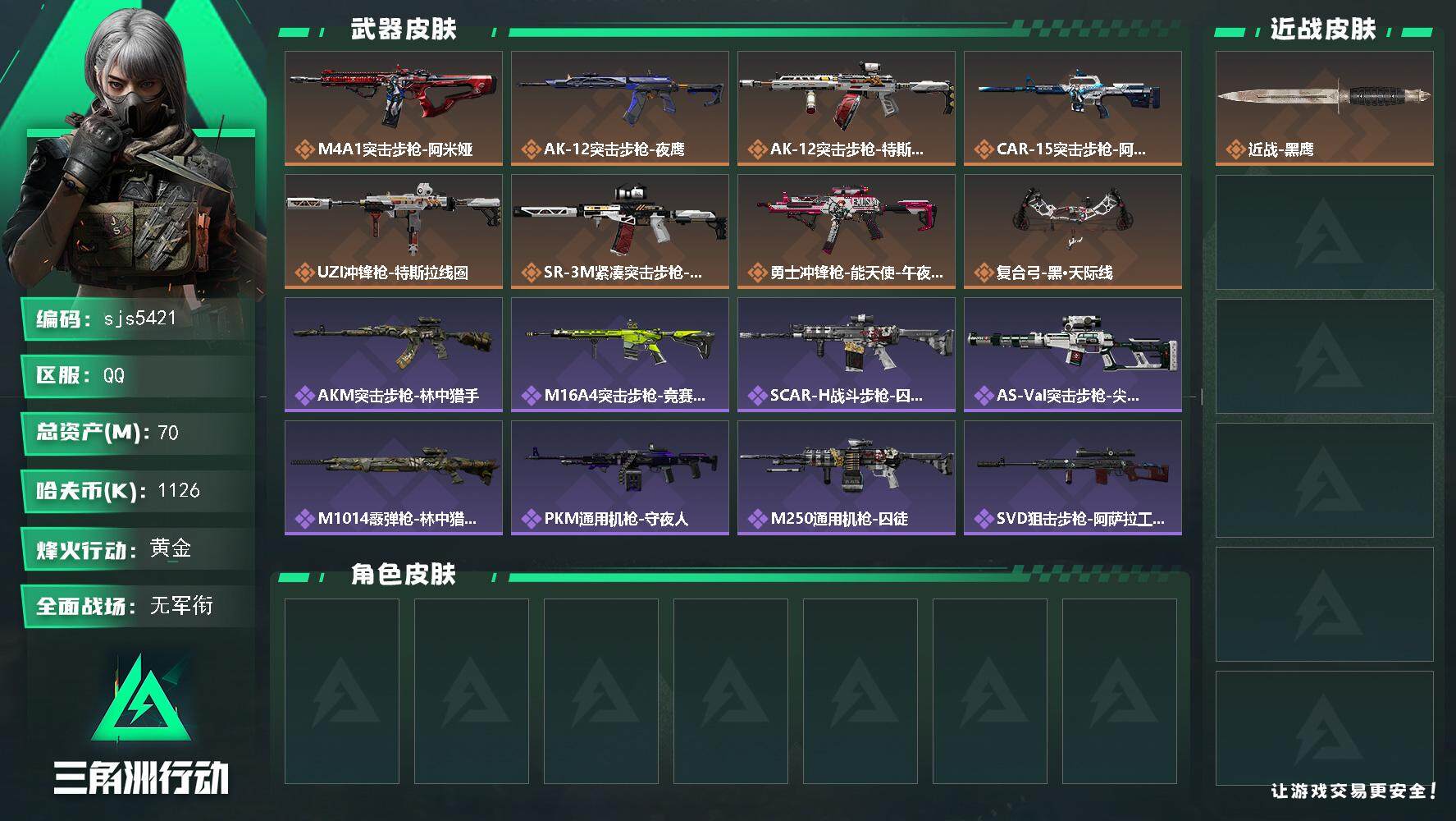 烽火地带段位: 黄金 全面战场段位: 无段位 总资产: 70000000 哈夫币: 1126000
