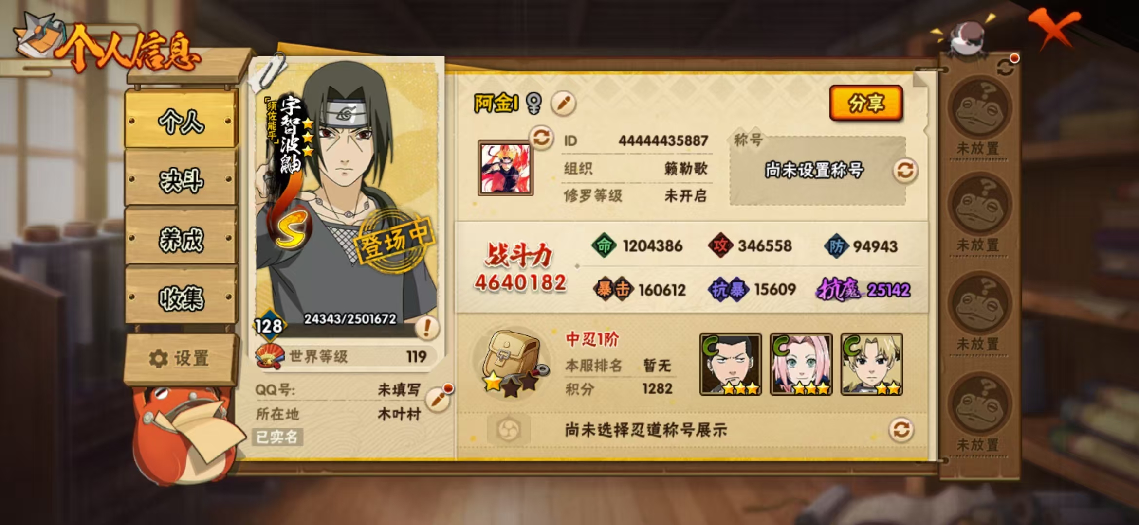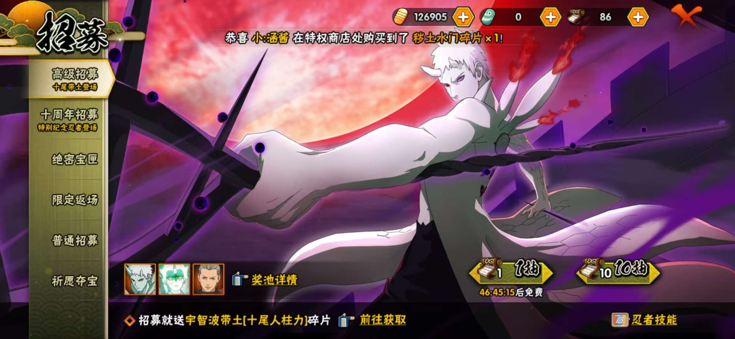 安卓qq4444区,纯金币小号,有12万金币,86高招券,可以抽1月高招S十尾带土有须佐鼬,自来也,