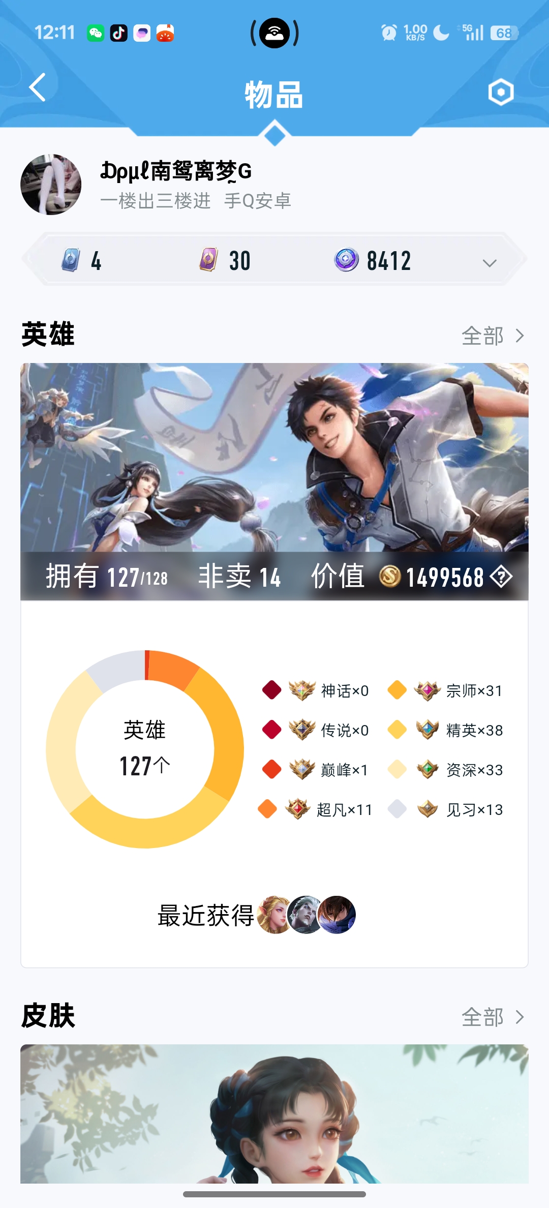 安卓QQ-1典藏-3传说-202皮肤-127英雄-永恒钻石-长时间不玩,现在想换点钱。谨慎购买,买了之后不退