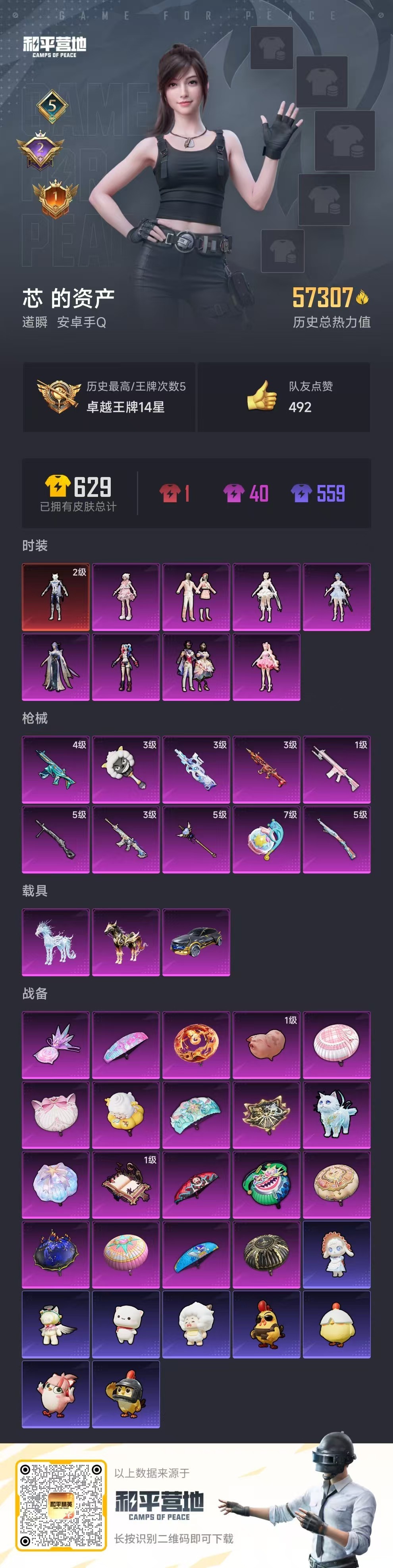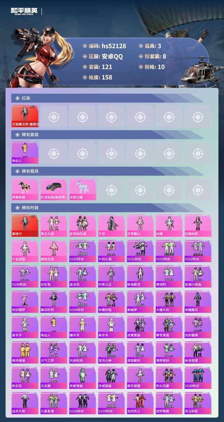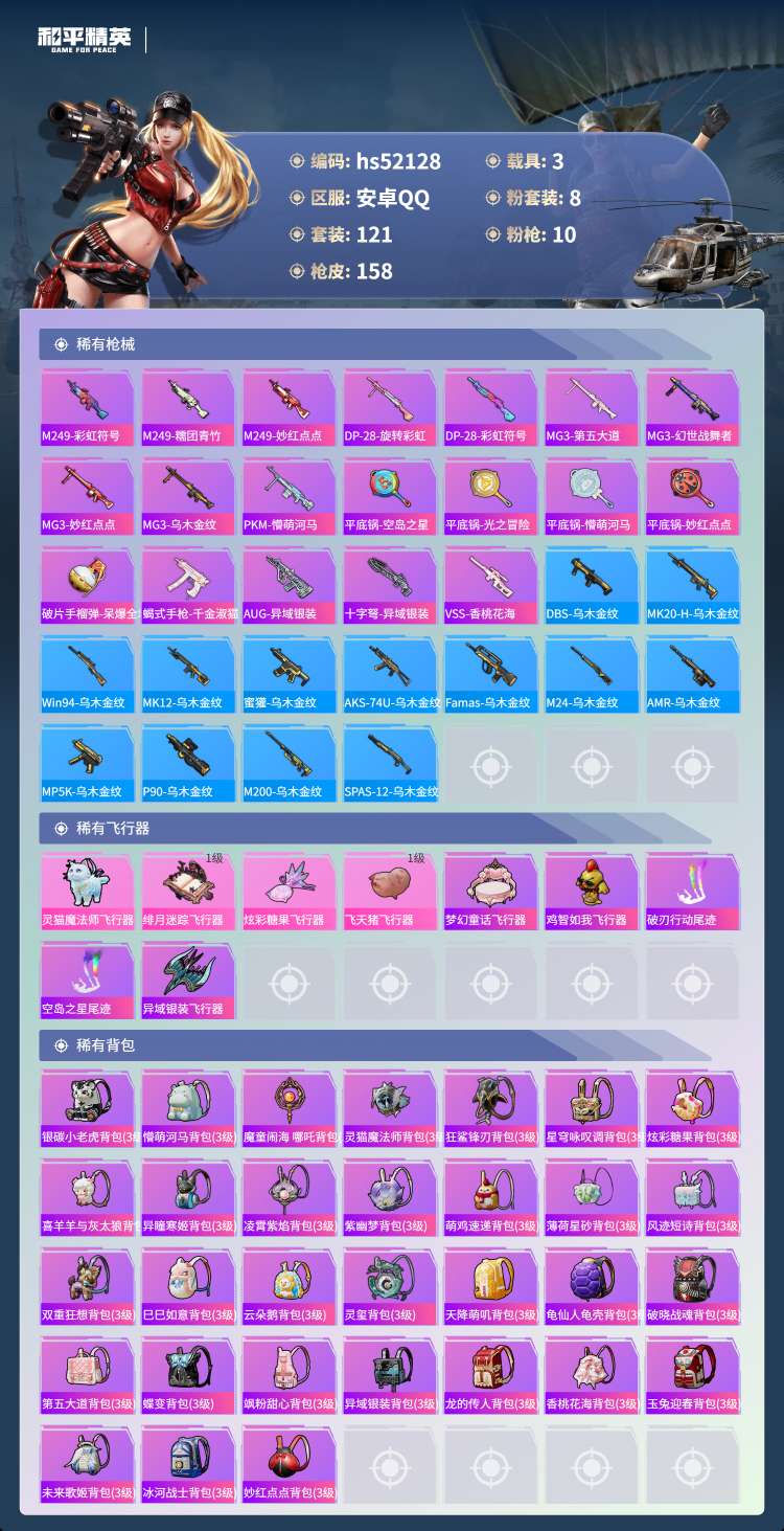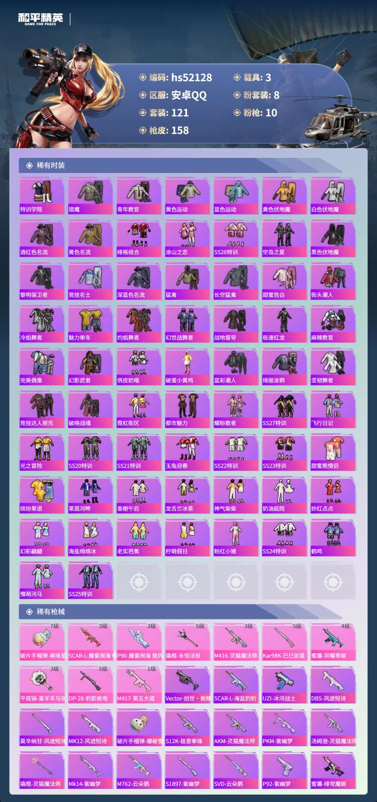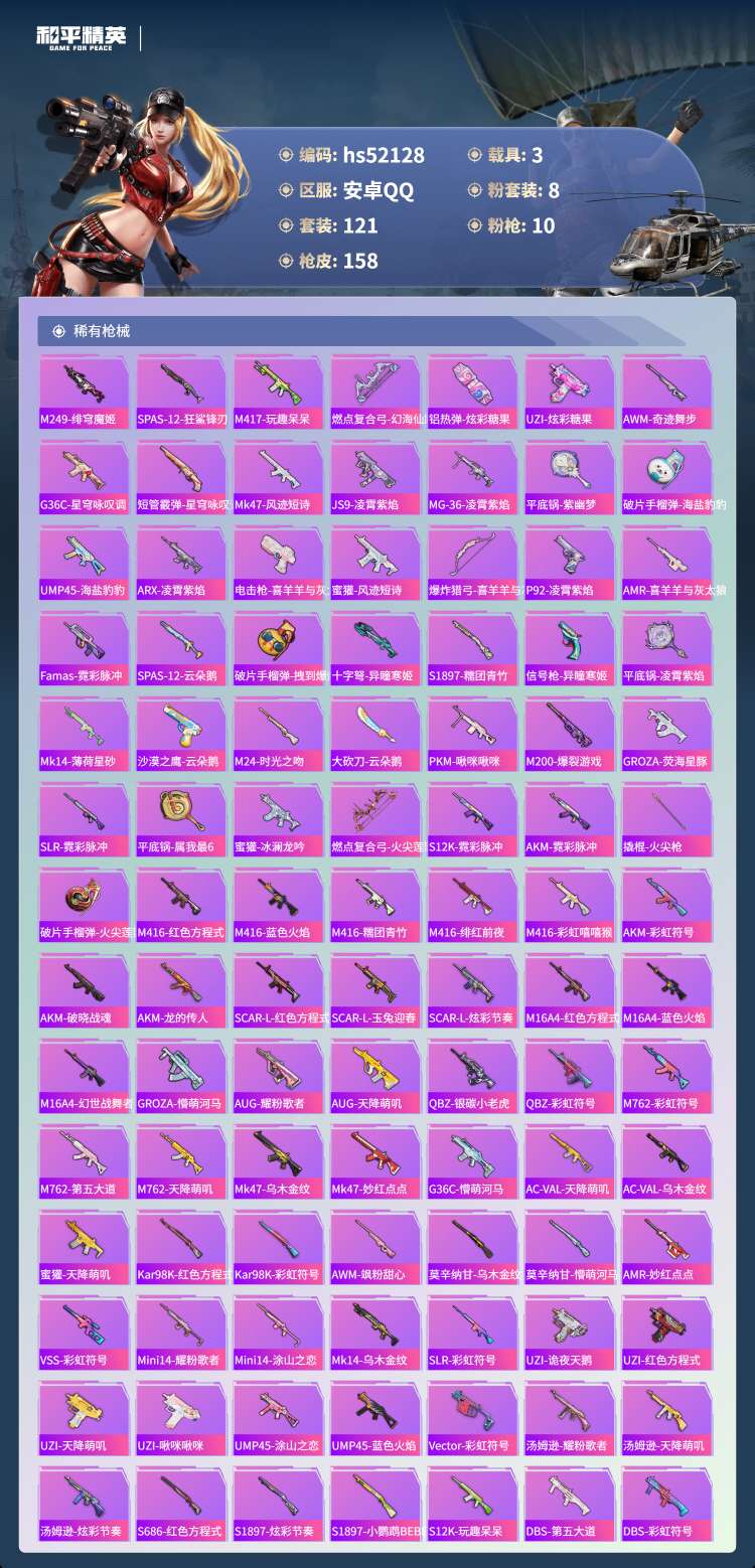 hs52128 安卓手Q-5王牌印记-1红装-8粉装-10特效枪-3载具-57307热力值-121套