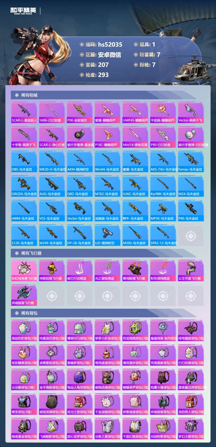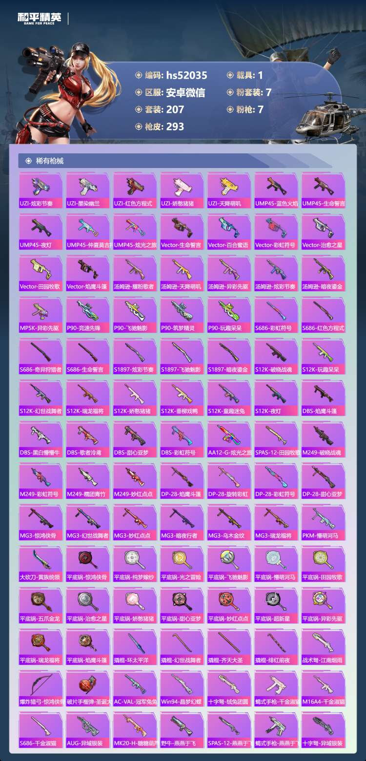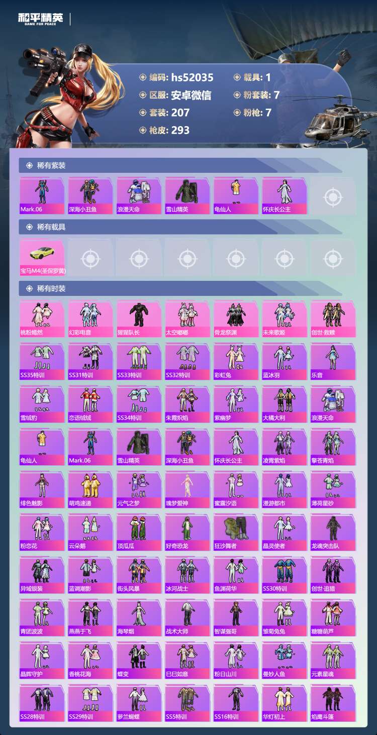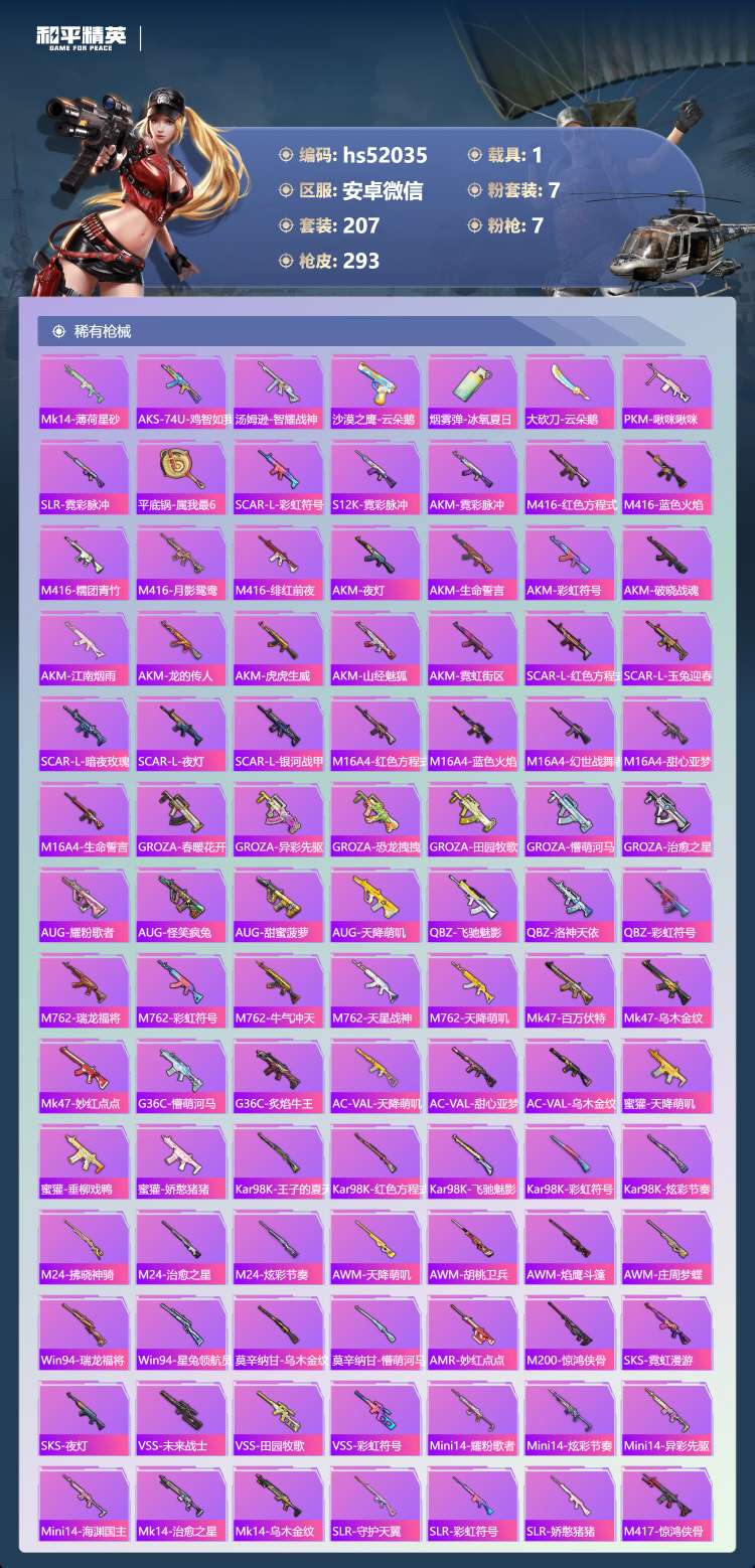 hs52035 安卓v-15王牌印记-7粉装-7特效枪-1载具-94861热力值-207套装-29