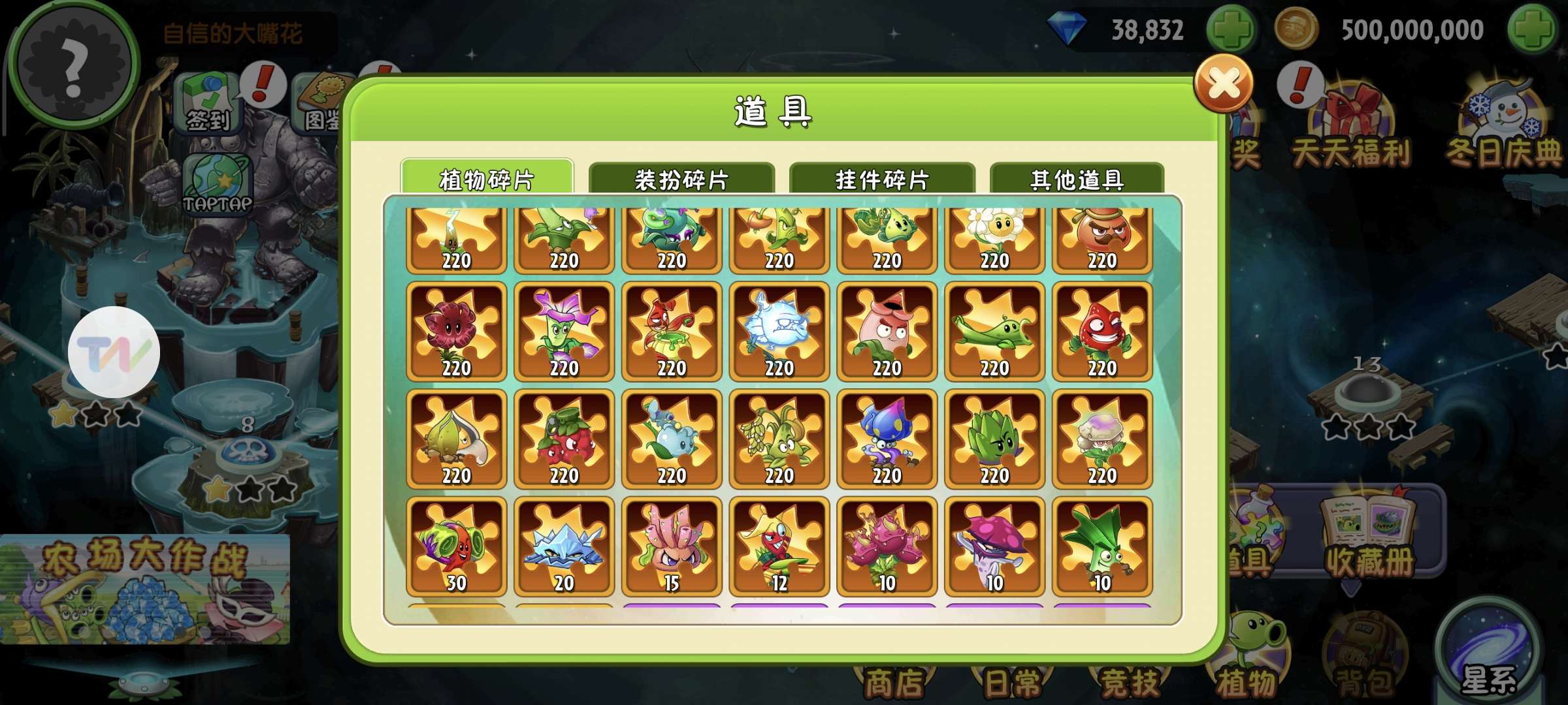 植物大战僵尸2,tap官网渠道,251植物碎片够满阶,全神器,大部分挂件,培养液不够