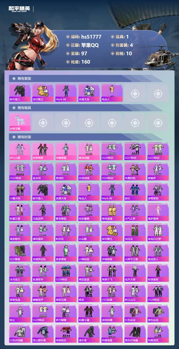 hs51777 苹果手Q-9王牌印记-4粉装-10特效枪-1载具-47351热力值-97套装-160