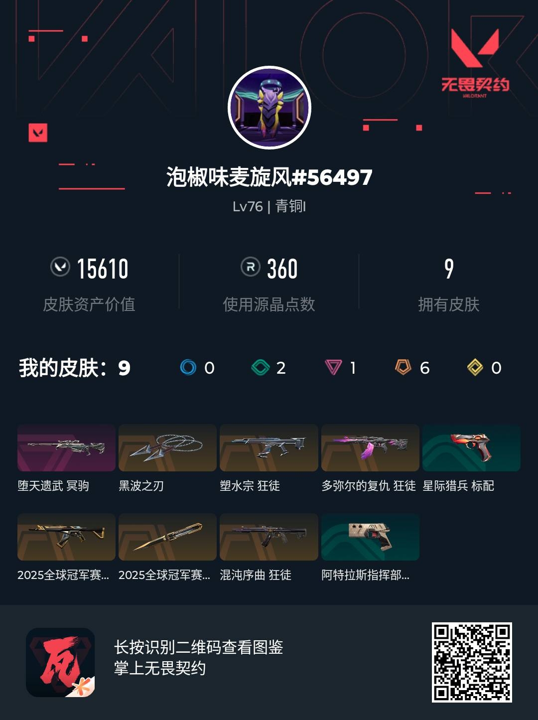ZMWW590游戏等级76-段位:青铜-皮肤价值15610-已用源晶点数360-英雄24-武器皮肤9 堕天遗武-冥驹 黑波之刃 塑水宗-狂徒 多弥尔的复仇-狂徒 2025全球冠军赛-狂徒 2025全球冠军赛-蝴蝶刀 混沌序曲-狂徒