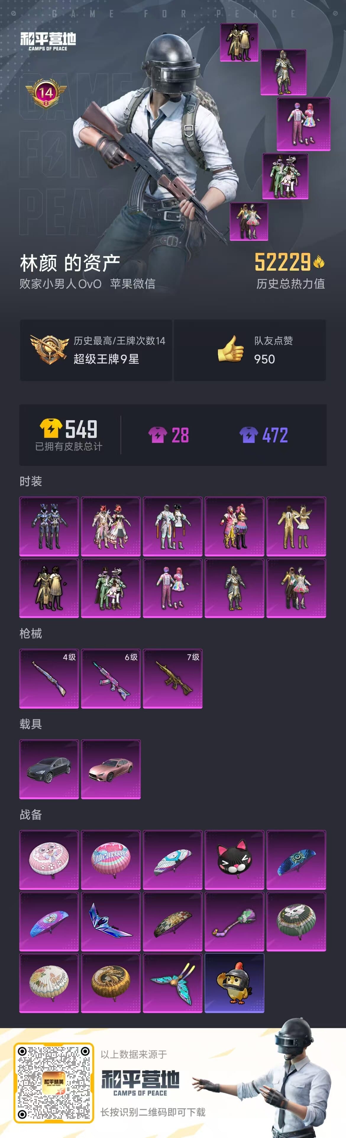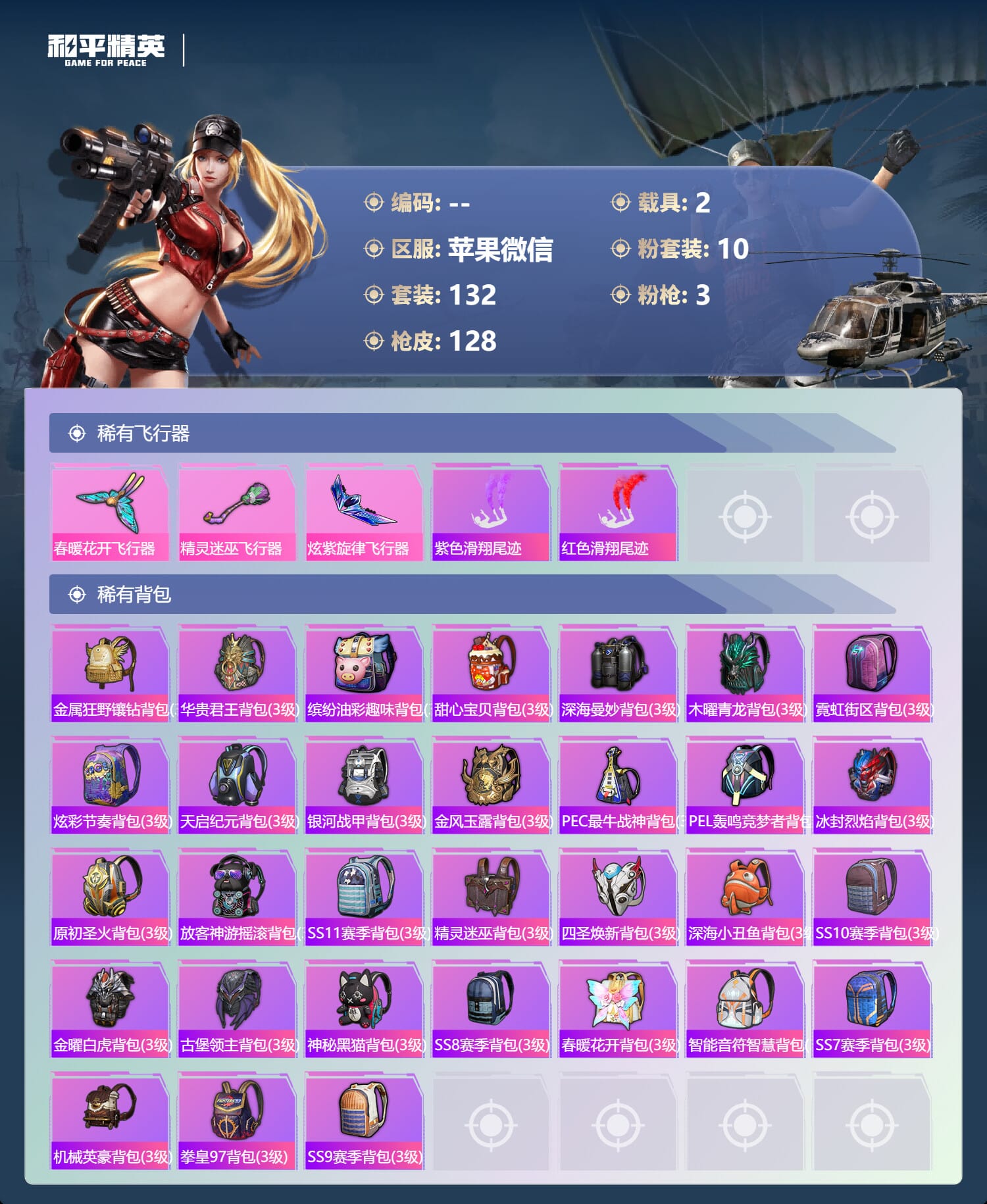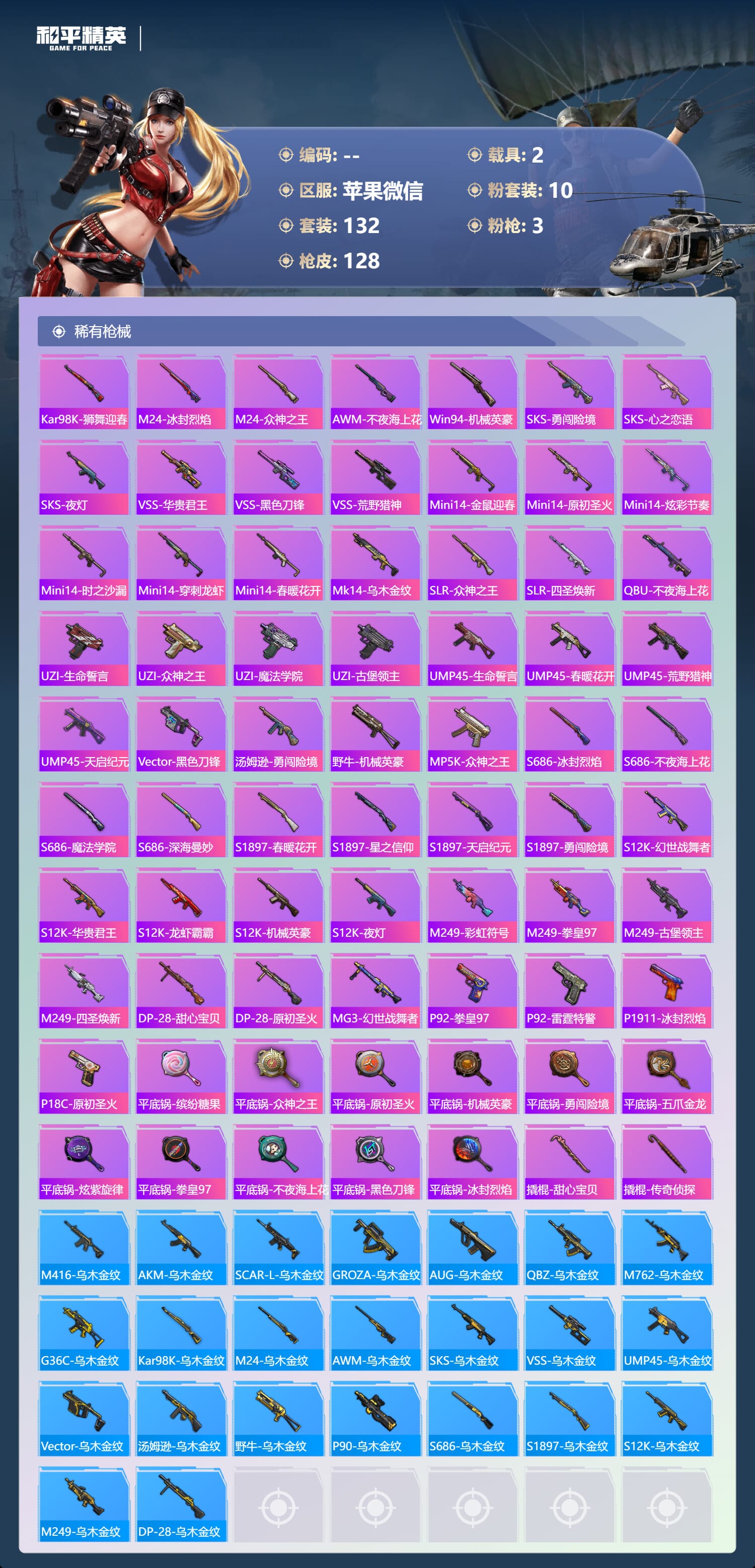 a4162/苹果微/-14王牌印记-10粉装-3特效枪-2载具-52229热力值-132套装-12