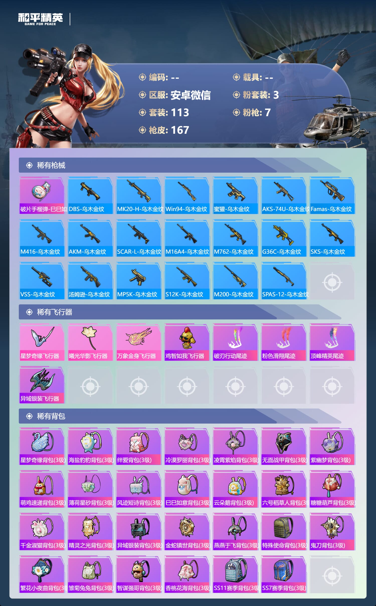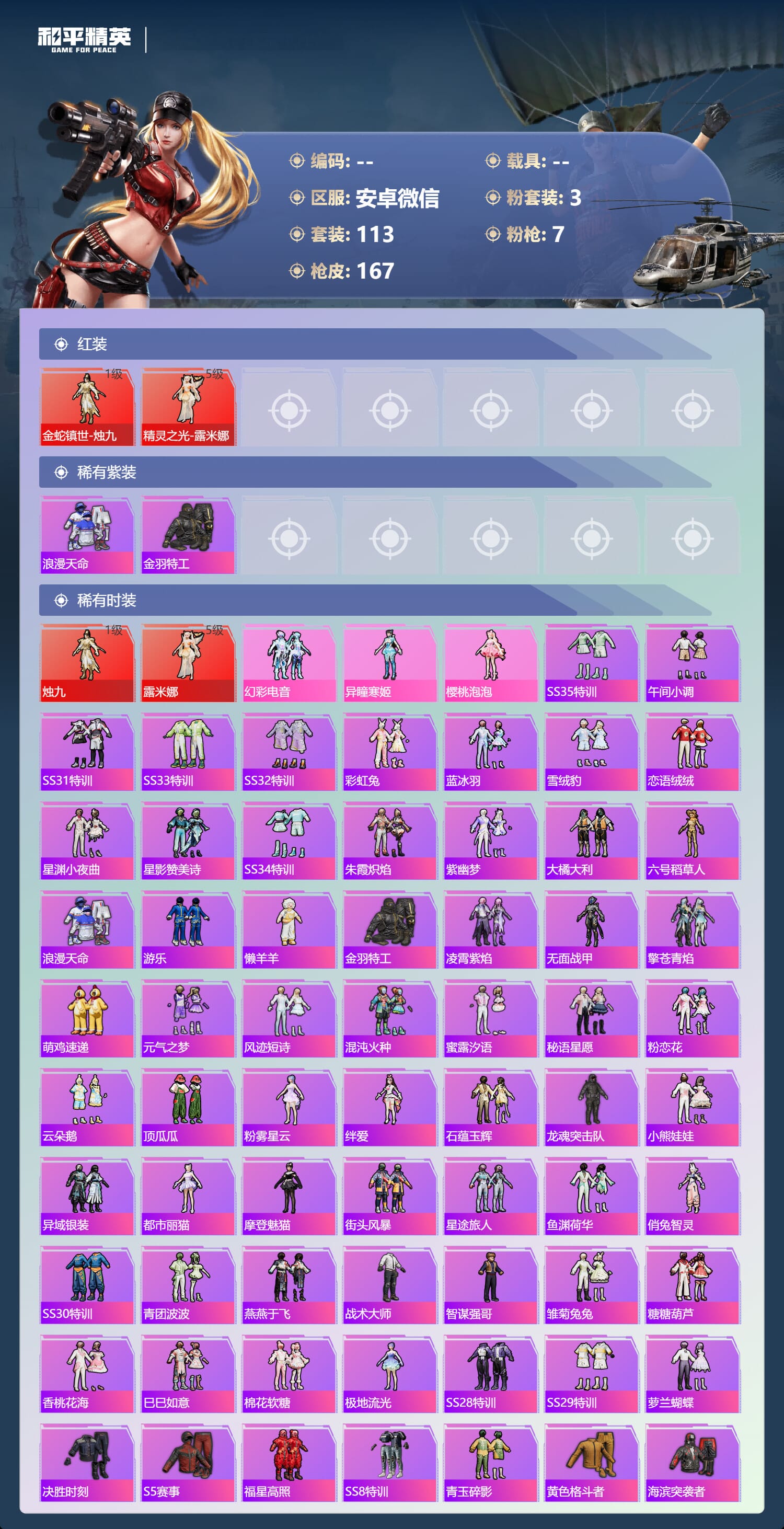 a4131/安卓微/-14王牌印记-2红装-3粉装-7特效枪-57803热力值-113套装-167