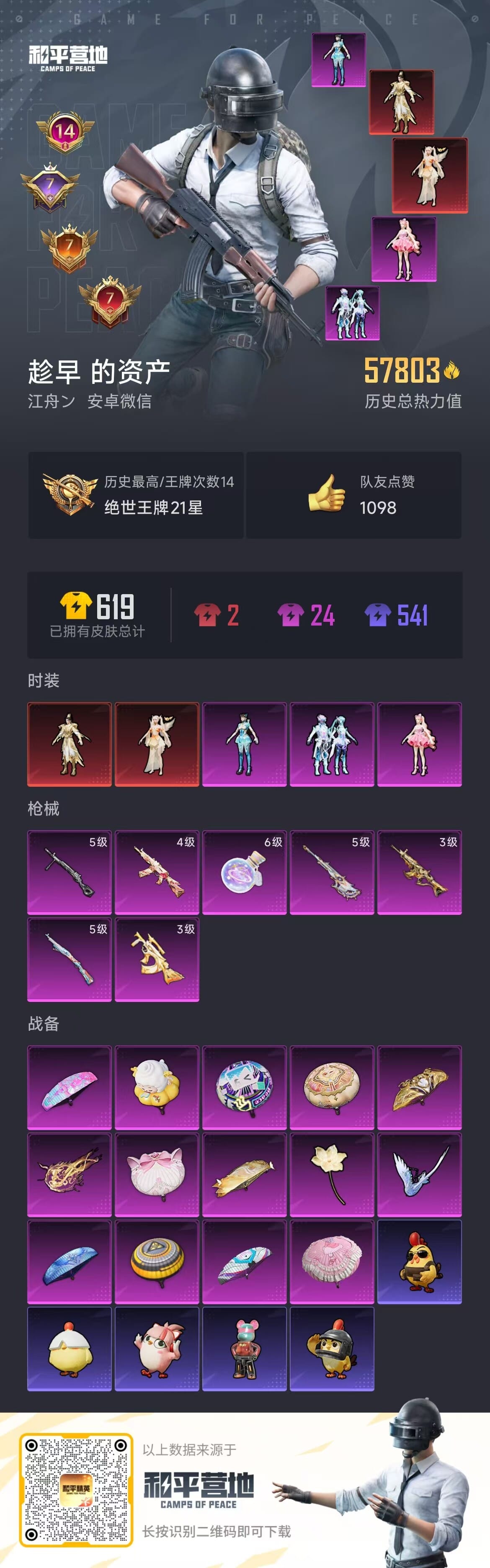 a4131/安卓v/-14王牌印记-2红装-3粉装-7特效枪-57803热力值-113套装-167
