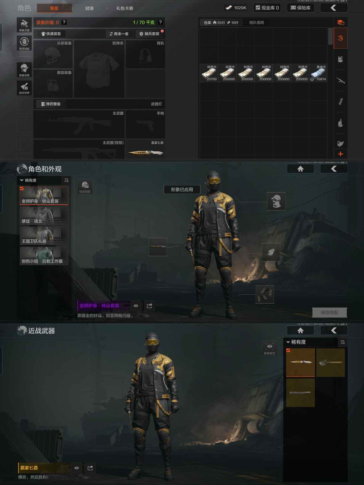 XXTW196安卓Q-等级30-仓库价值1M-科恩币1020K 【套装】 金狮护身·转运套装 使徒·瑞文 王国卫队礼装 创伤小组·后勤工作服 【刀皮】 赢家匕首 来战·开山刀 【枪皮】 骑士之剑·AK74u 秋宴·FAL 猩红抓痕·AKM 竞技·AUG 赢家·F2000 【挂饰】 青花鱼挂饰