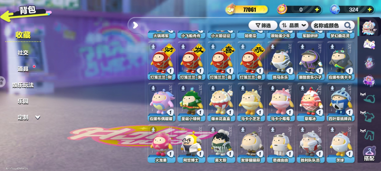 紫皮:蜜蜂 DongDong,DongDong, 猴吼吼,小浮冰,蓝舞鞋瑞拉,道具师芙芙,小演员露希,袋鼠嘟宝,吟游诗人弥亚,天狗刑云,神月将军夜魄,狸猫大力,机械师维迪,铃兰三月兔,蓝樱爱丽丝,超燃蛋小绿,大娃,发美美,鲤鱼姬小锦,打菜侠妙妙,飞天
