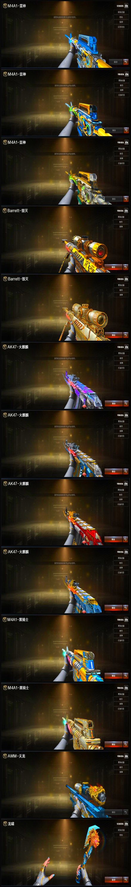 DYCF012【陕西一区-陕西】 122V 11王者4炫金VIP2【主武器类型】 HK417-朱雀 Barrett-毁灭 *2 Barrett-极光 *2 AWM-裁决 *4 M4A1-雷神 QBZ03-金色蔷薇 *2 M4A1-黑龙 *3 王者之势觉醒版 M4A1-黑骑士 *2 M4A1-堕天神 M4A1-千变 死神-雪域霜狐 M4A1-龙血 AK47-火麒麟 *5 王者之翼觉醒版 AK47-黑武士 *3 黑武士CF网剧冠军 AK47-黑鲨 *6 AK47-机械迷城 烈火-9A-91 汤姆逊-
