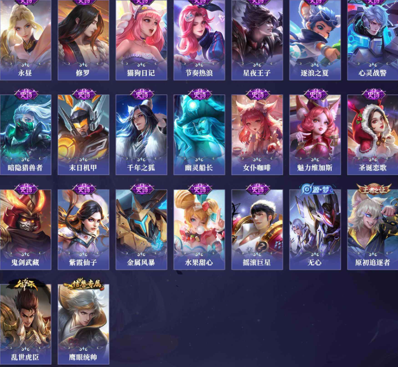贵族:V5 英雄数:125 皮肤数:158 蔷薇恋人 特工战影 地狱之眼 鸣野蒿 逐花归海 幽灵船长 原初追逐者 金属风暴 紫霞仙子 鬼剑武藏 飞衡 逐浪之夏 暗隐猎兽者 五谷丰年 节奏热浪 电玩·爆裂旋风 水果甜心 乱世虎臣 赏金猎手 李小龙 修罗 鹰眼统帅 末日机甲 星界游侠 魅力维加斯 女仆咖啡 摇滚巨星 百木心枪 皇家上将 箭羽风息 猫狗日记 心灵战警 无心 星夜王子 圣诞恋歌 曙光守护者
