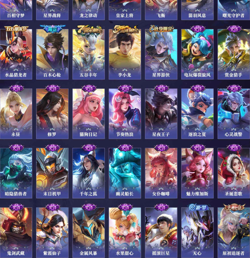 贵族5 传说皮肤3 史诗皮肤38 皮肤数量158
