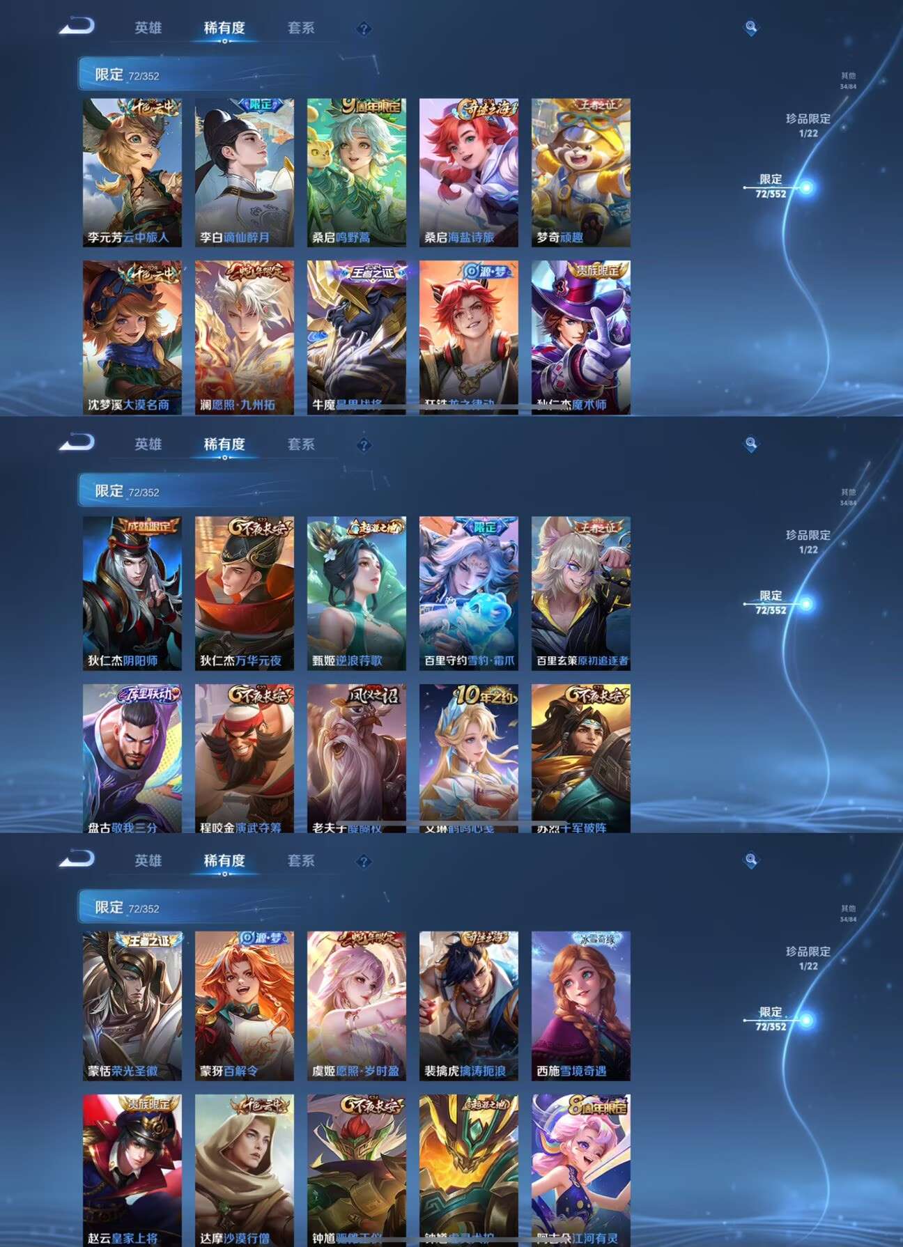 【史诗皮肤】 破空之剑 茶境仙 星界战将 电玩小子 御风骁将 至尊宝 谪仙醉月 山海·玄木吟 雪豹·霜爪 逐霄战戟 敬我三分 聚星闪耀 江河有灵 完美运算 百解令 荣光圣徽 顽岩魄 龙之律动 化蝶舞 巫礼祀神 涂山容容 万灵启世 罗小黑战记 星界游侠