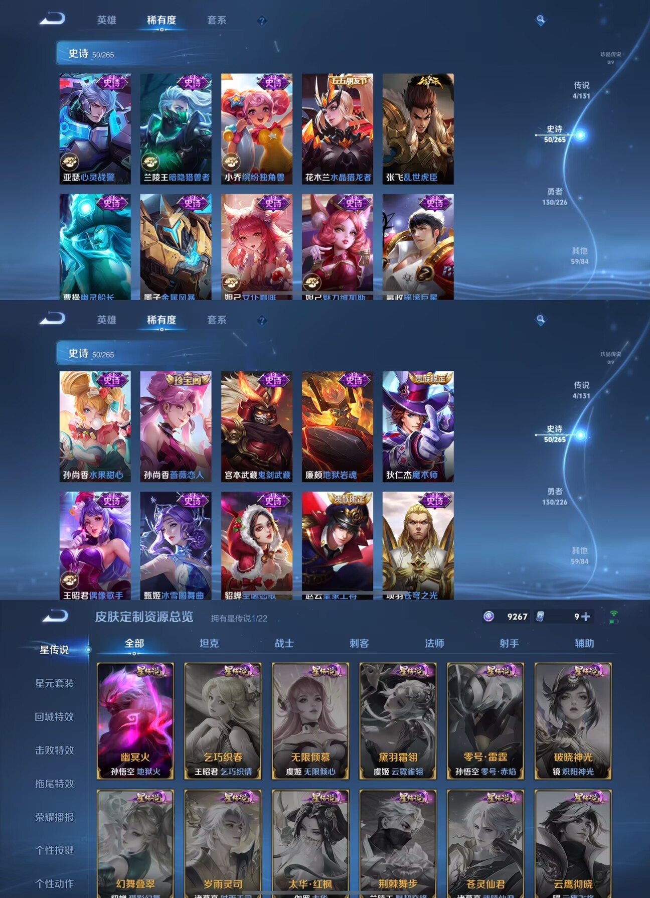 【史诗皮肤】 茶境仙 敬我三分 聚星闪耀 江河有灵 完美运算 荣光圣徽 龙之律动 涂山容容 顽趣 舞动绿茵 幽灵船长 功夫厨神 女仆咖啡 魅力维加斯 魔术师 鹰眼统帅 圣诞恋歌 真爱魔法 鬼剑武藏 水晶猎龙者 曙光守护者 暗隐猎兽者 驯魔猎人 航海奇遇记 逐浪之夏 银河之约 地狱岩魂 金属风暴 梁祝 李小龙 水果甜心 蔷薇恋