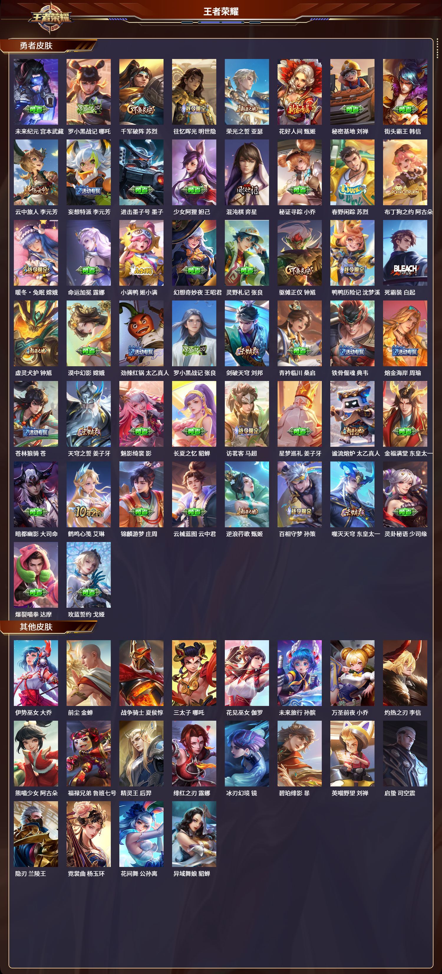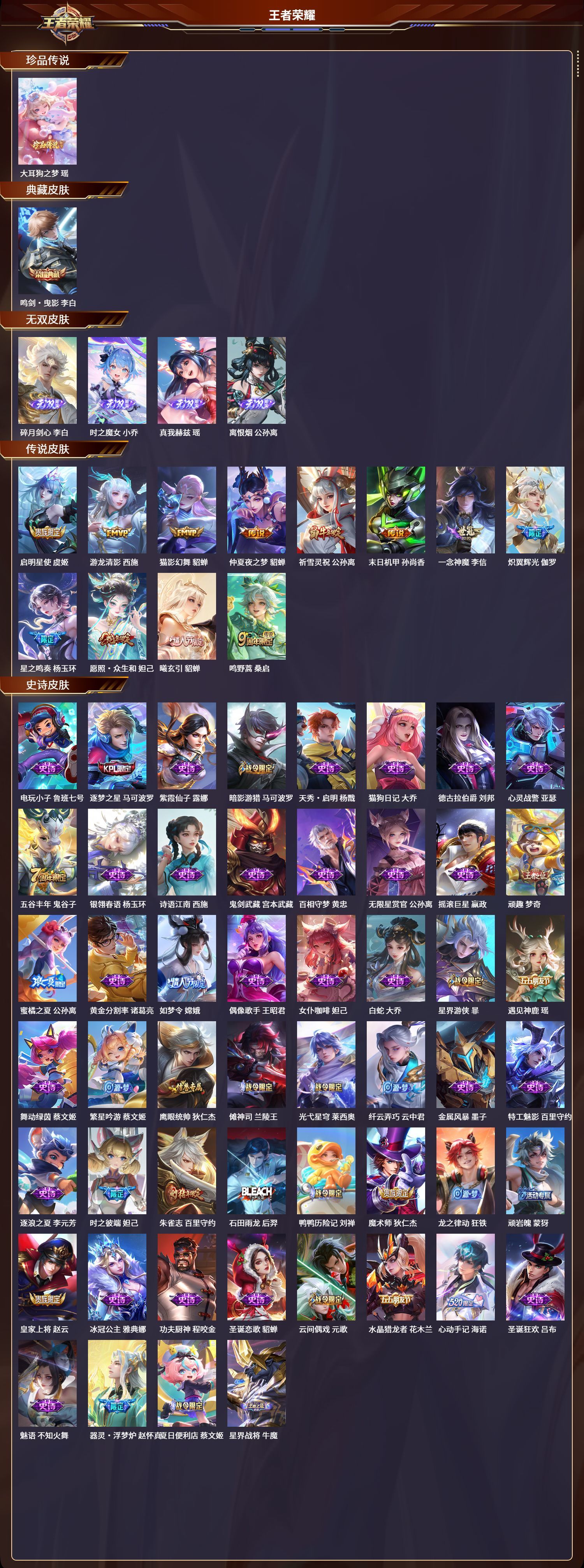 绝世王者/236皮肤/127英雄/1典藏/0珍品无双/4无双/1珍品传说/12传说/69史