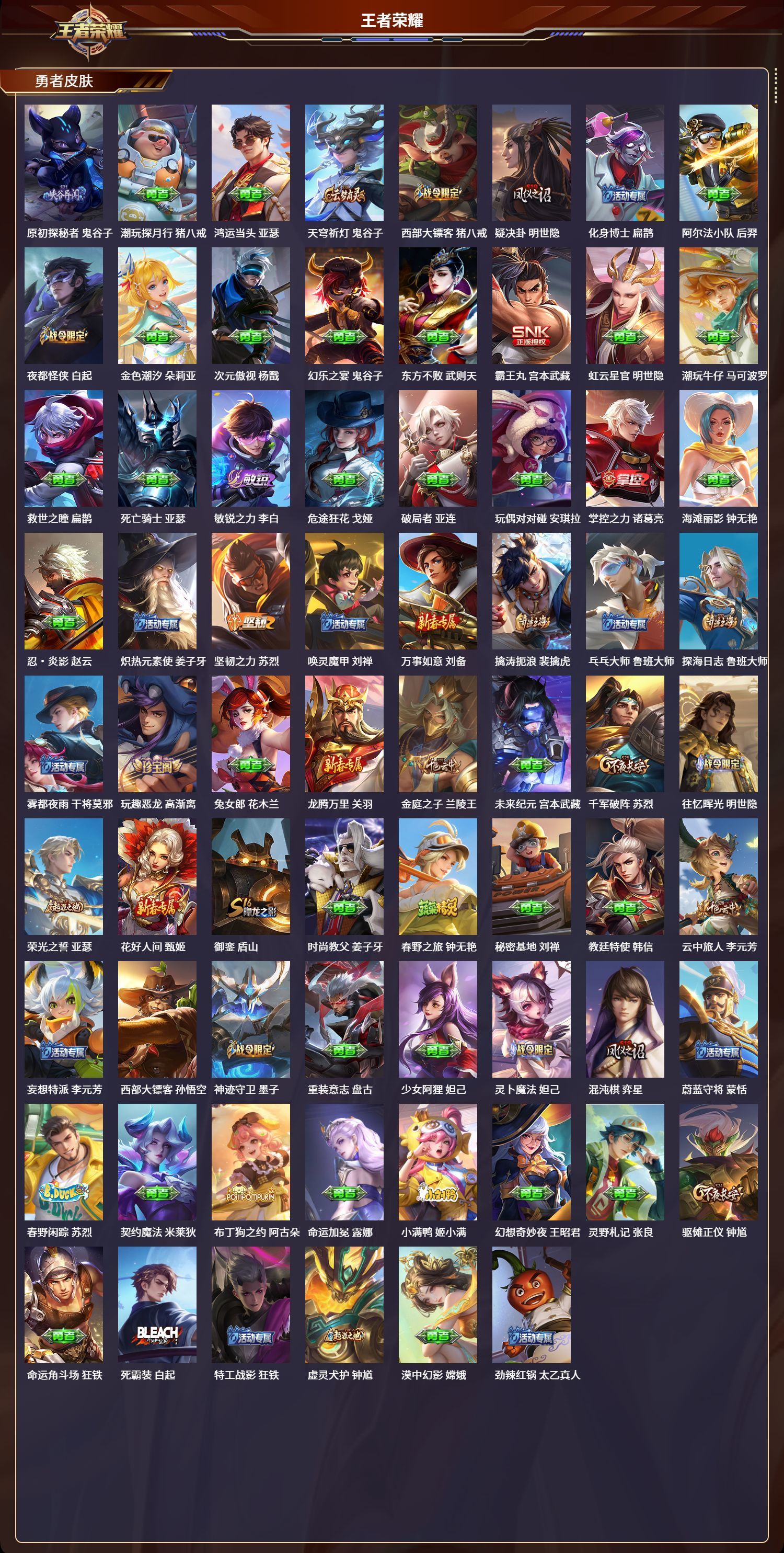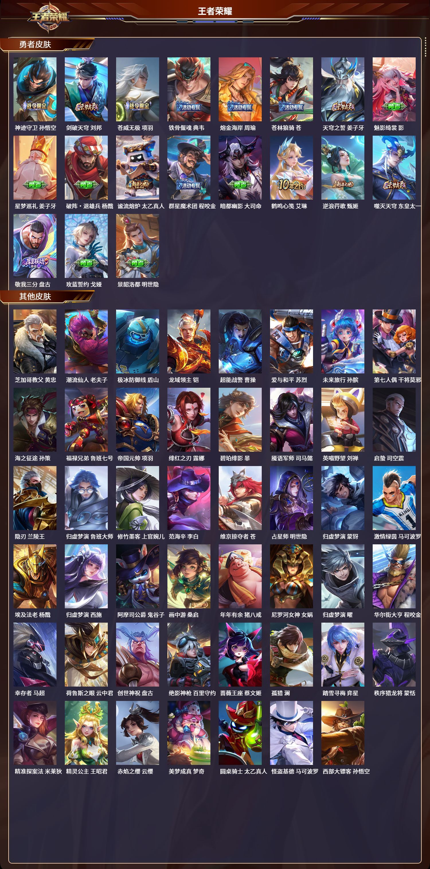 安卓QQ/荣耀王者/274皮肤/126英雄/1典藏/0珍品无双/1无双/1珍品传说/19传说/76史