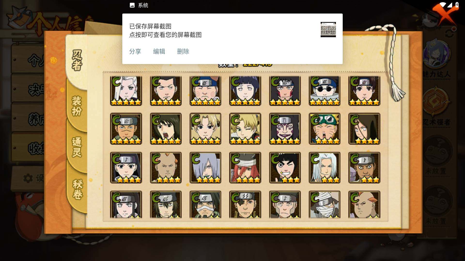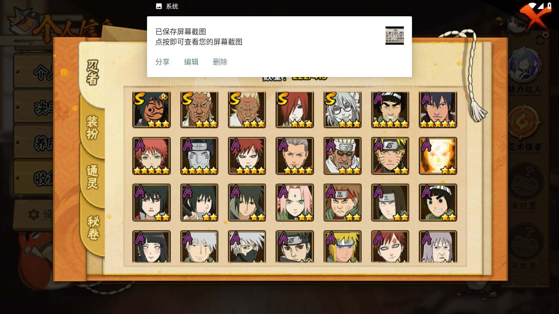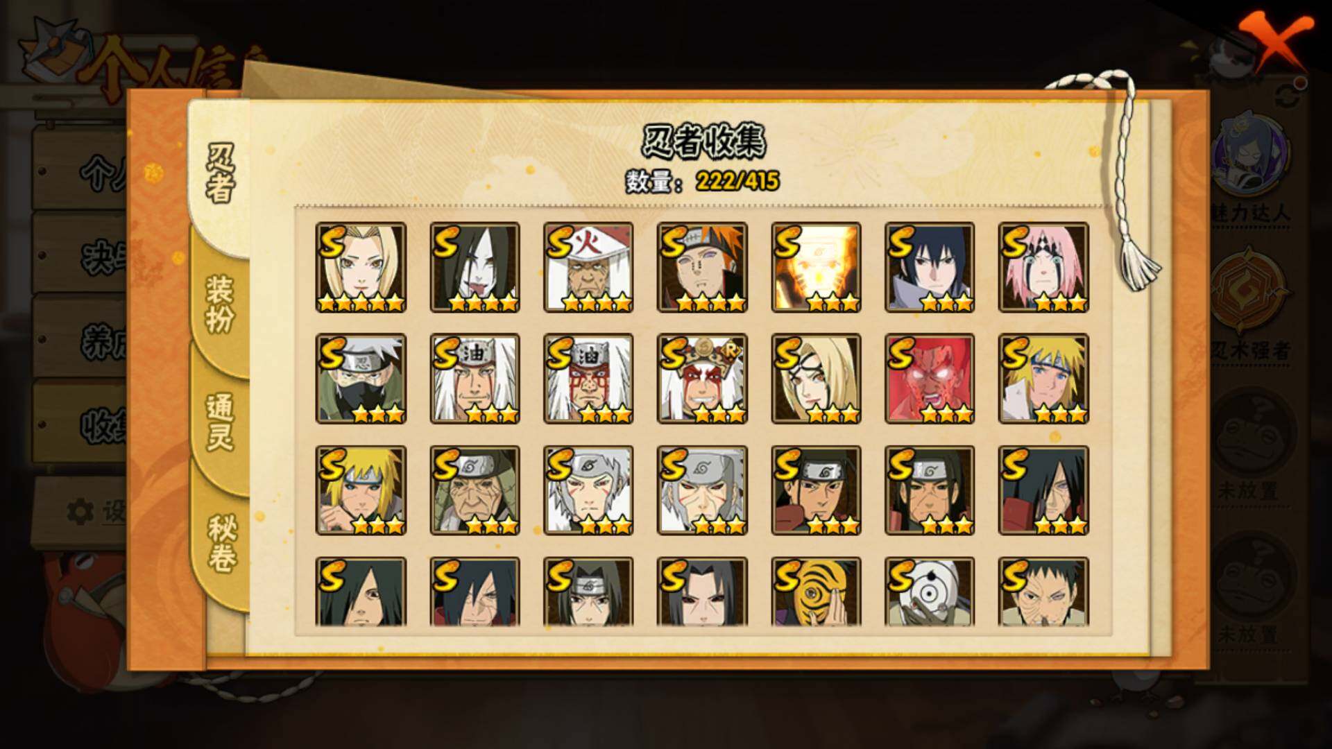 【S级忍者】:长门「秽土转生」(3星),猿飞日斩「秽土转生」(3星),波风水门「秽土转生」(3星),千手扉间「秽土转生」(3星),千手柱间「秽土转生」(3星),宇智波鼬「秽土转生」(3星),宇智波斑「秽土转生」(3星),宇智波斑「秽土转生·解」(3星),春野樱「忍界大战」(3星),宇智波带土「忍