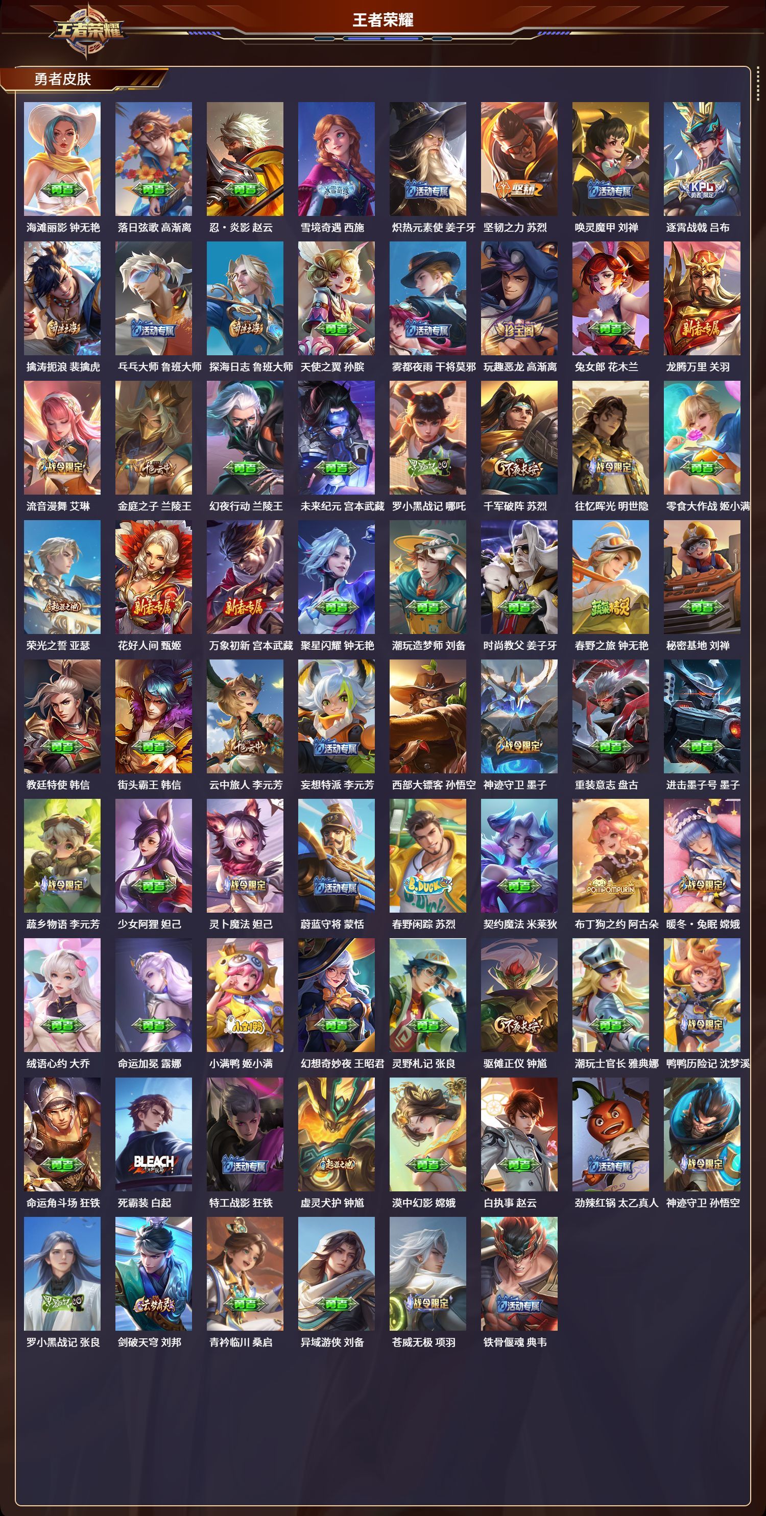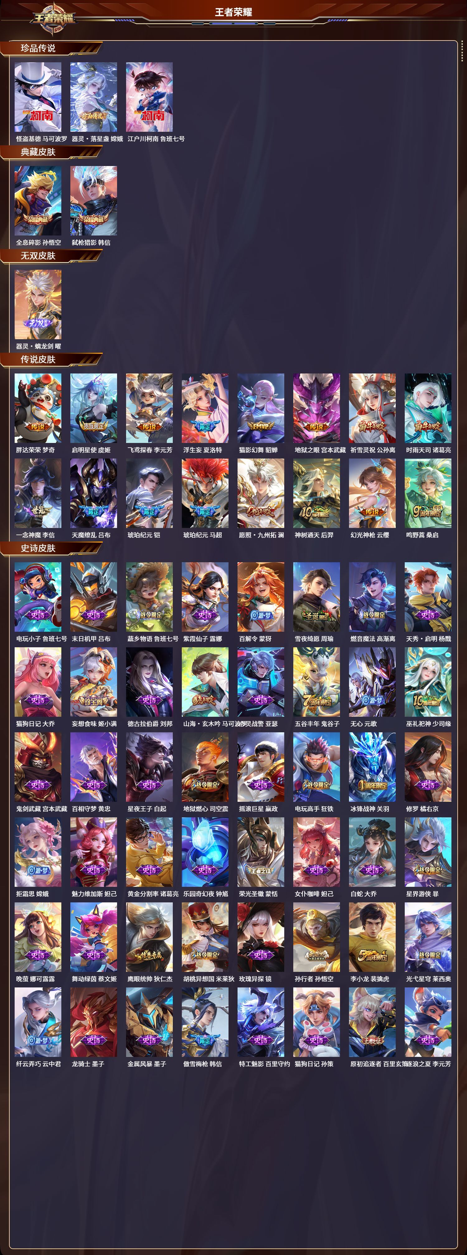 安卓QQ/荣耀王者/373皮肤/127英雄/2典藏/0珍品无双/1无双/3珍品传说/16传说/112