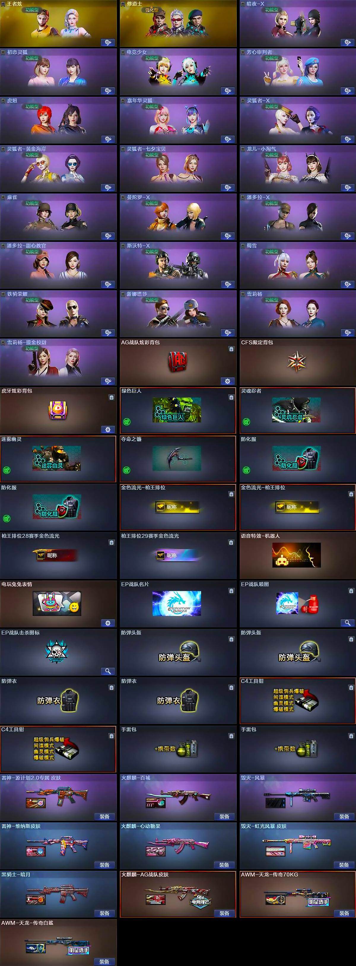 【皮肤】:雷神-维纳斯皮肤,雷神-源计划2.0专属 皮肤,火麒麟-AG战队皮肤,火麒麟-百城,火麒麟-心动糖果,毁灭-风暴,毁灭-虹光风暴 皮肤,黑骑士-暗月,AWM-天龙-传奇70KG,AWM-天龙-传奇白鲨