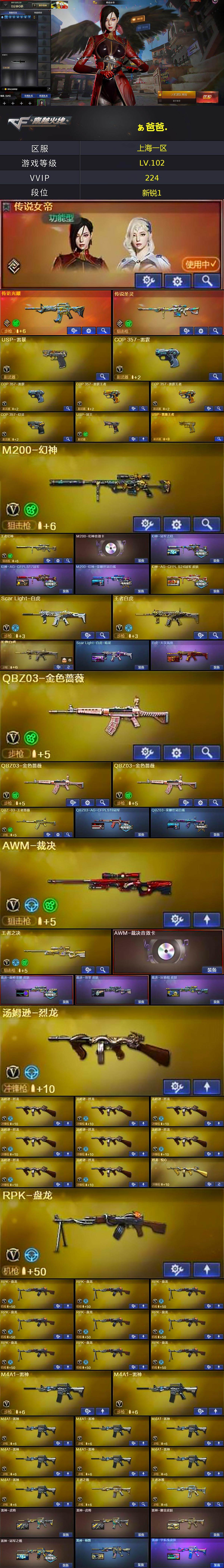 【热门武器】:传说光耀,传说圣灵,王者白虎,QBZ03-金色蔷薇*3,Scar Light-白虎,M4A1-青龙,M200-幻神,荣耀世冠-火麒麟,Cat-刀锋,M4A1-黑骑士*4,汤姆逊-烈龙*9,RPK-盘龙*10,加特林-炼狱*4,USP-雷暴,COP 357-幻灵,沙鹰-修罗*10,炽芒蝶刃
