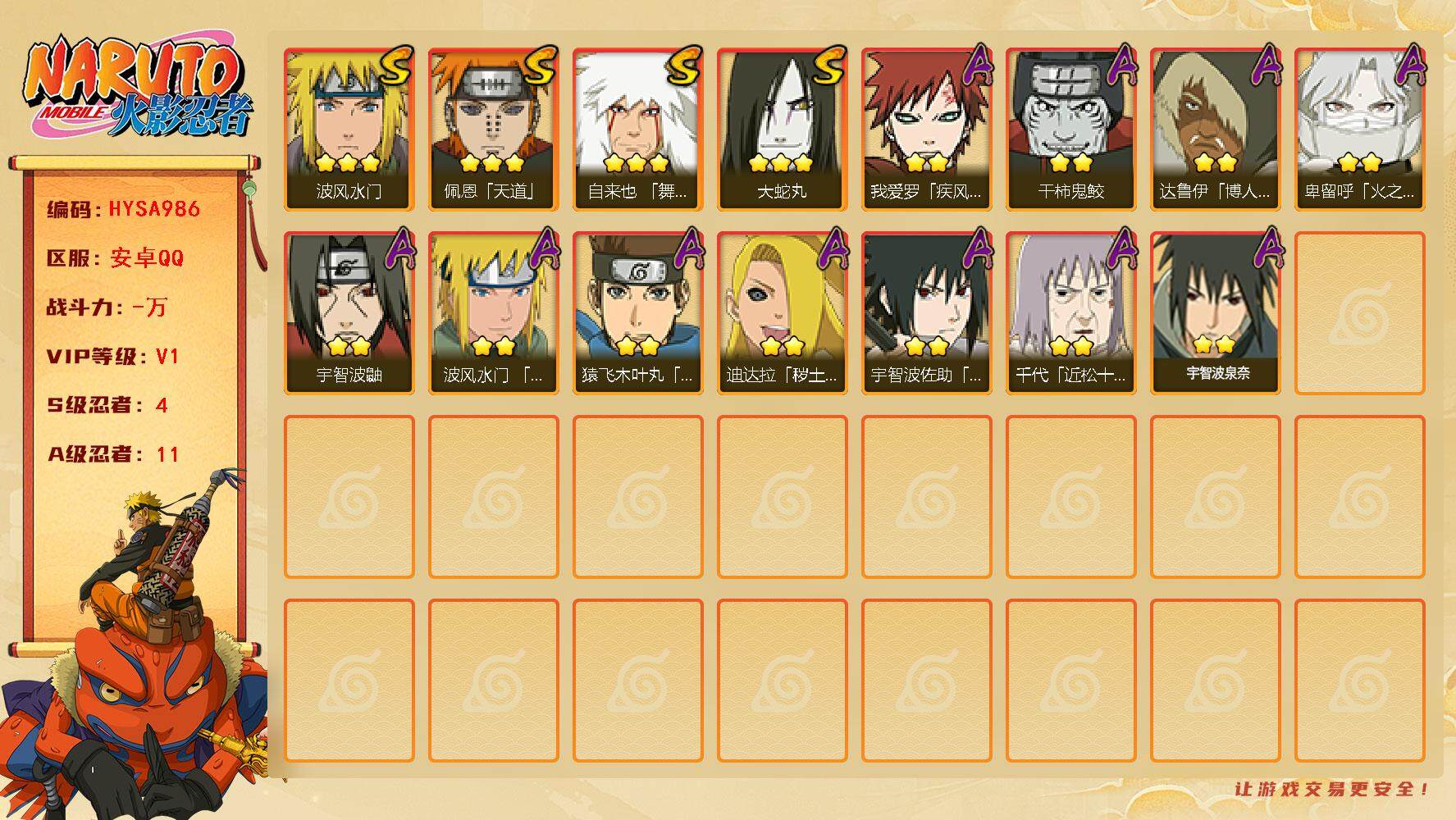 【HYSA986】V1/S忍4/A忍11/通灵兽12/舞之豪杰-自来也/疾风传-我爱罗/五代目雷影-达鲁伊/宇智波鼬/秽土转生-迪达拉/天道-佩恩/波风水门/2星宇智波泉奈/干柿鬼鲛/大蛇丸/须佐能乎-宇智波佐助/火之意志继承者-卑留呼/猿飞木叶丸/近松十人卫-千代/青年-波风水门