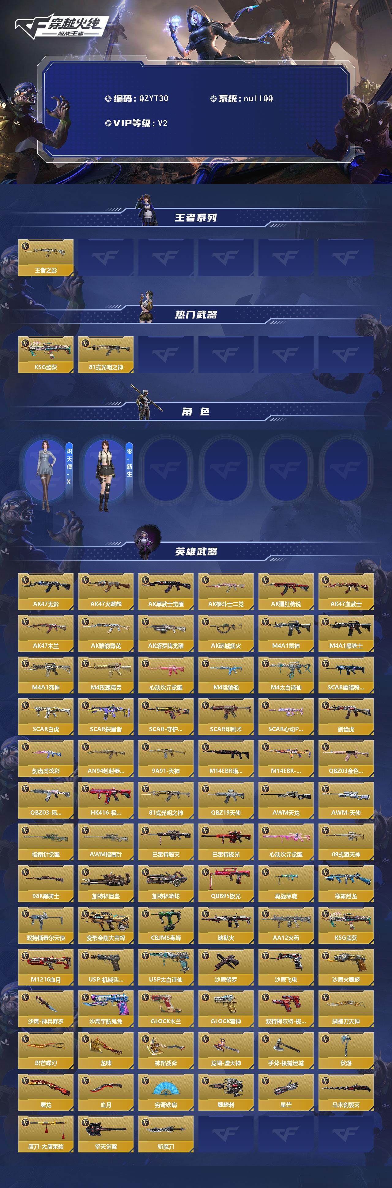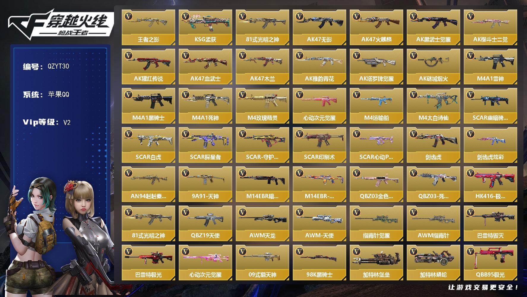 【QZYT30】VIP2/150V/王者之影/KSG-孟获/81式-光明之神/炽天使-X/零-新生/AK47-无影/AK47-火麒麟/AK47-黑武士觉醒/AK47-樱斗士-二觉/AK47-猩红传说/AK47-血武士/AK47-木兰/AK47-雅韵青花/AK47-塔罗牌觉醒/AK47-谜城烟火/M4A1-雷神/M4A1-黑骑士/M4A1-死神/M4A1-玫瑰精灵/M4A1-心动次元觉醒/M4A1-运输船/M4A1-太白诗仙/SCAR-幽暗骑士/SCAR Light-白虎/SCAR-探星者/SCA