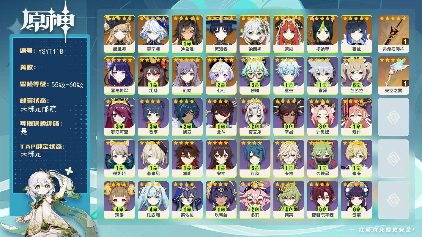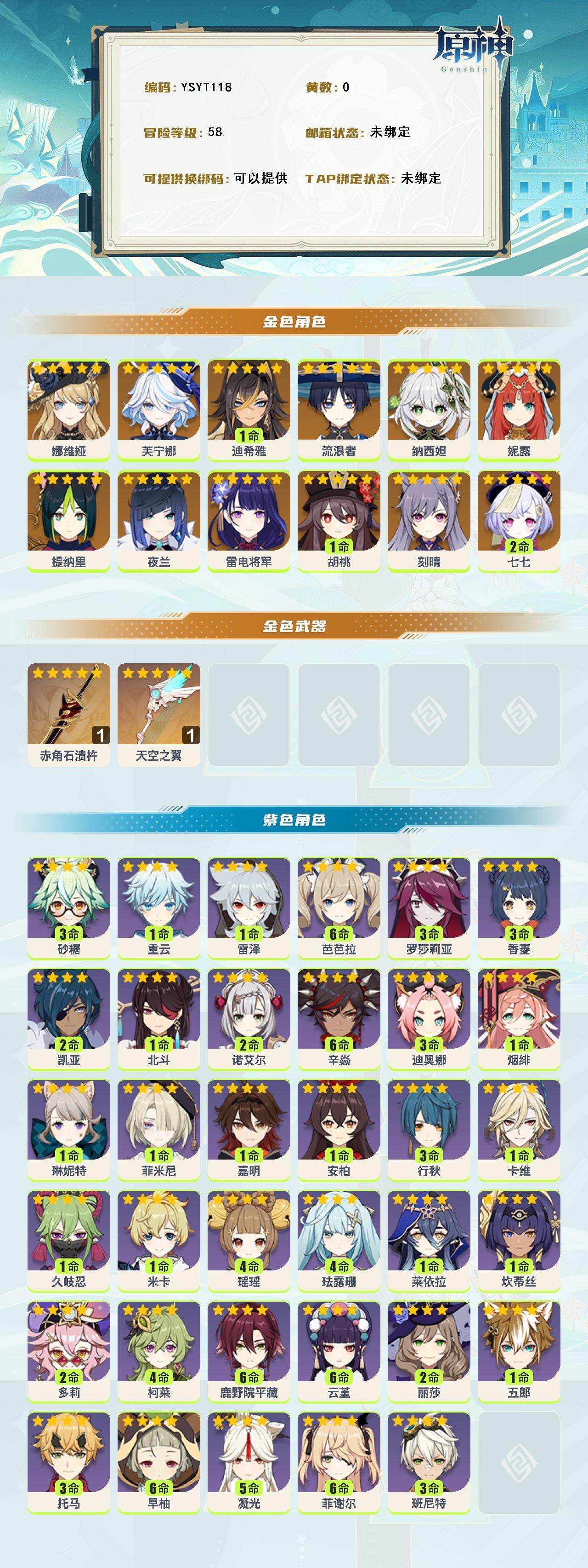 【YSYT118】58级/男主/13个五星角色/娜维娅/芙宁娜/1命迪希雅/流浪者/纳西妲/妮露/提纳里/夜兰/雷电将军/1命胡桃/刻晴/2命七七/赤角石溃杵/天空之翼/嘉明/1命菲米尼/1命琳妮特/1命卡维/米卡/4命瑶瑶/4命珐露珊/1命莱依拉/坎蒂丝/2命多莉/4命柯莱/满命鹿野院平藏/1命久岐忍/满命云堇/1命五郎/3命托马/满命早柚/烟绯/3命罗莎莉亚/满命辛焱/3命迪奥娜/3命砂糖/雷泽/满命菲谢尔/2命丽莎/1命北斗/3命香菱/安柏/3命班尼特/3命行秋/满命芭芭拉/5命凝光/2命