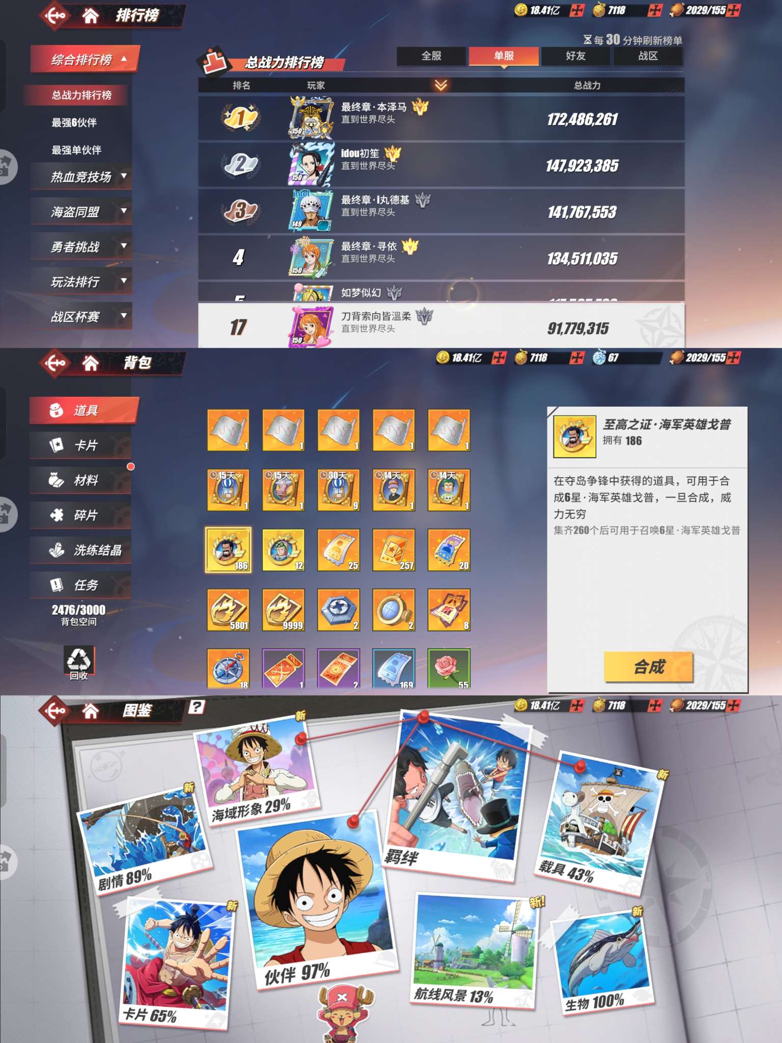 9100万全图鉴只缺4个(青年卡普 克比 新萨博 饼干人)186青年卡普碎片 3个98友情技 2神船