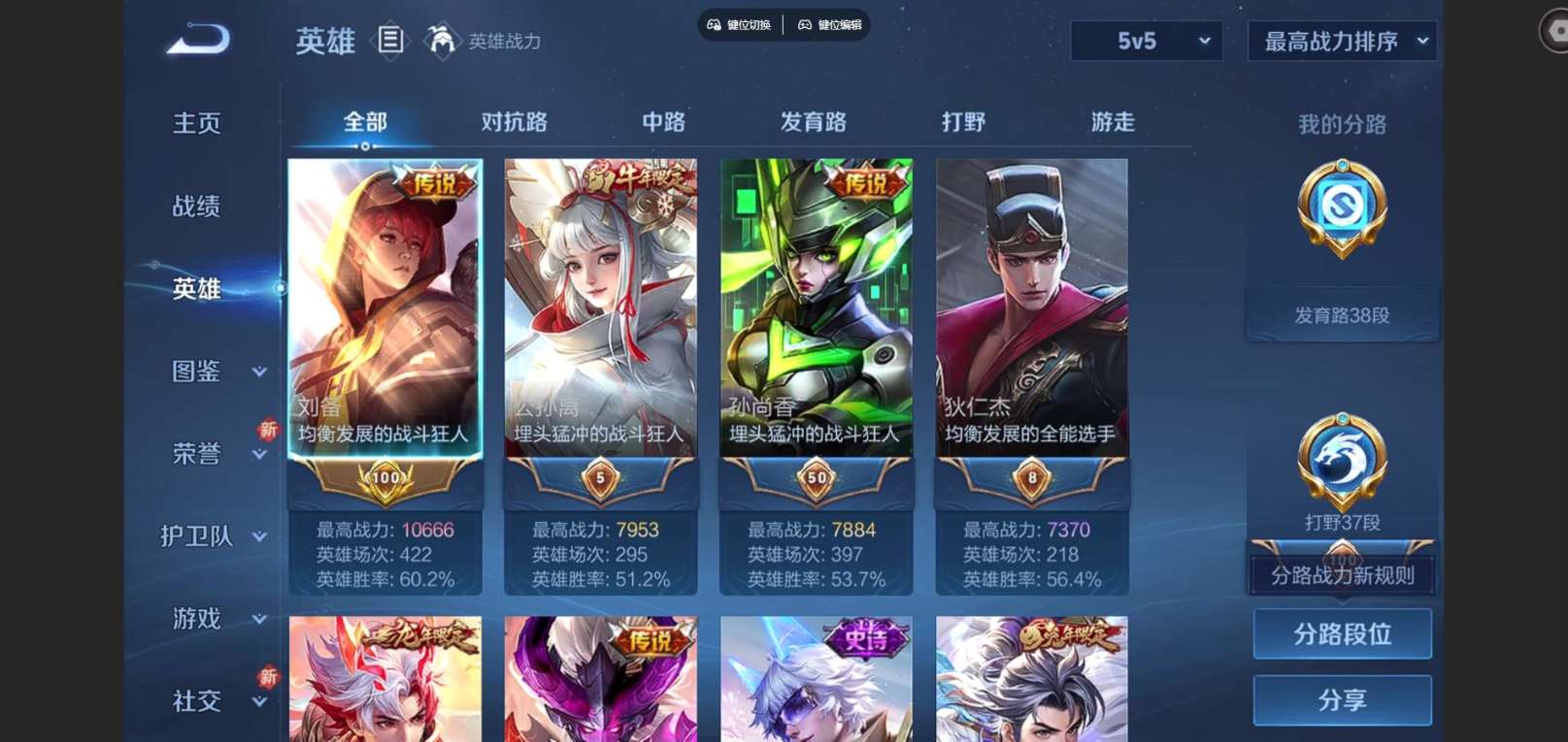 125英雄-320皮肤-V8/1典藏1无双3珍品传说28传说 发育路38段 打野37段 金标刘备 2