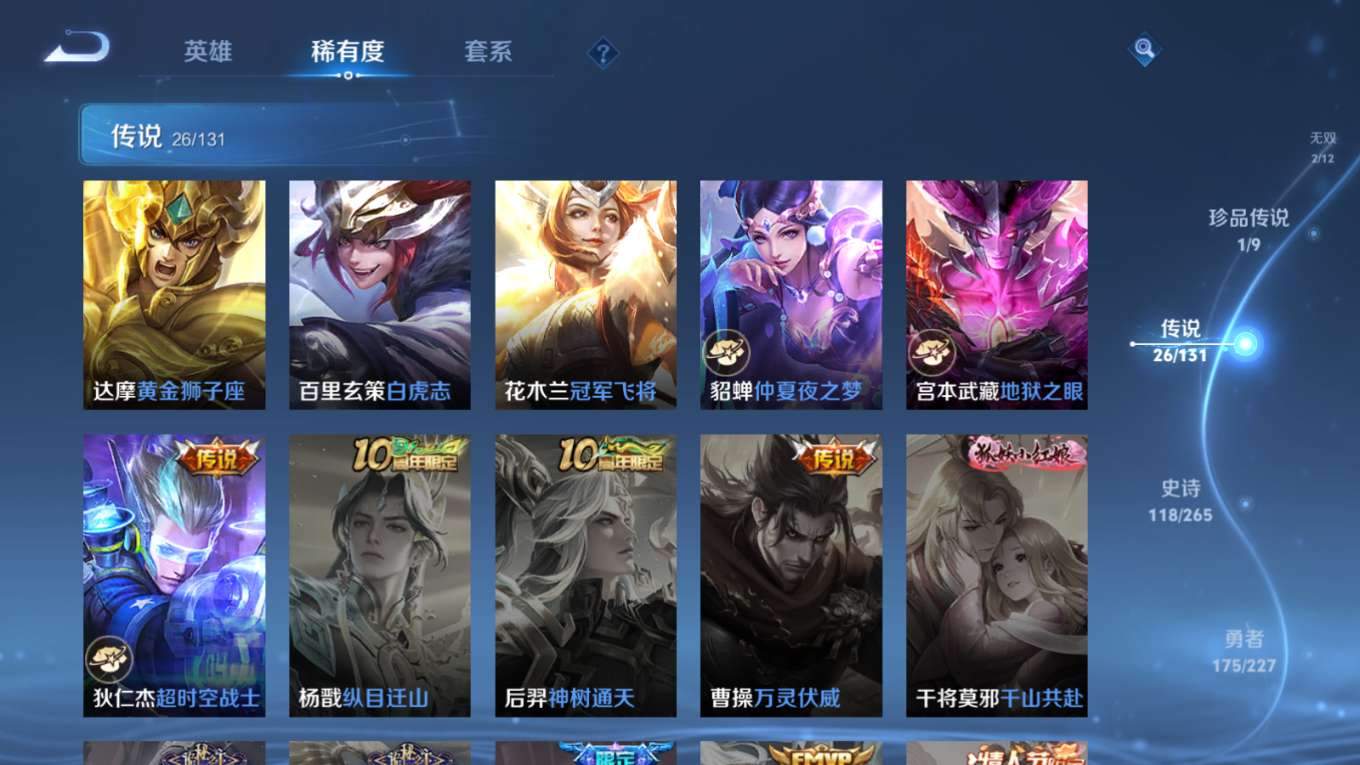 125英雄-395皮肤-2典藏2无双1珍品传说24传说 中路40段 对抗路34段 金标米莱狄 金标夏