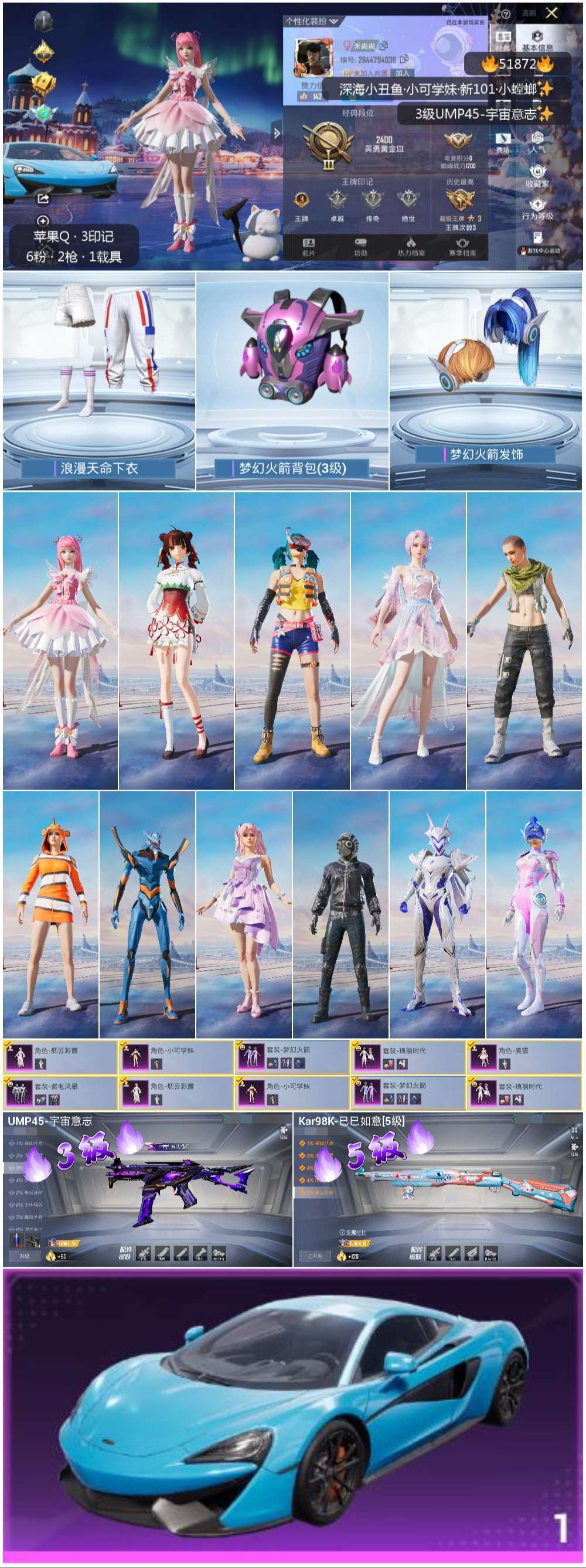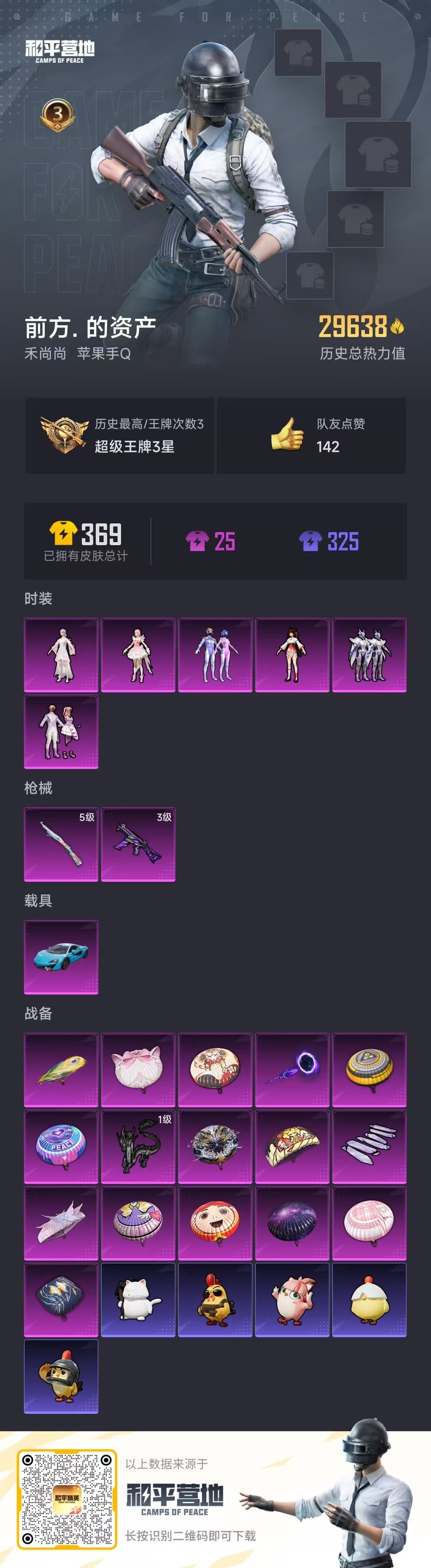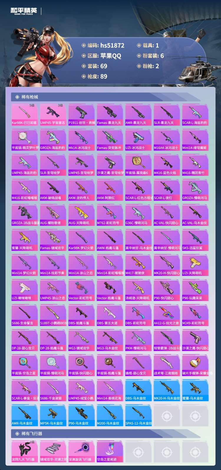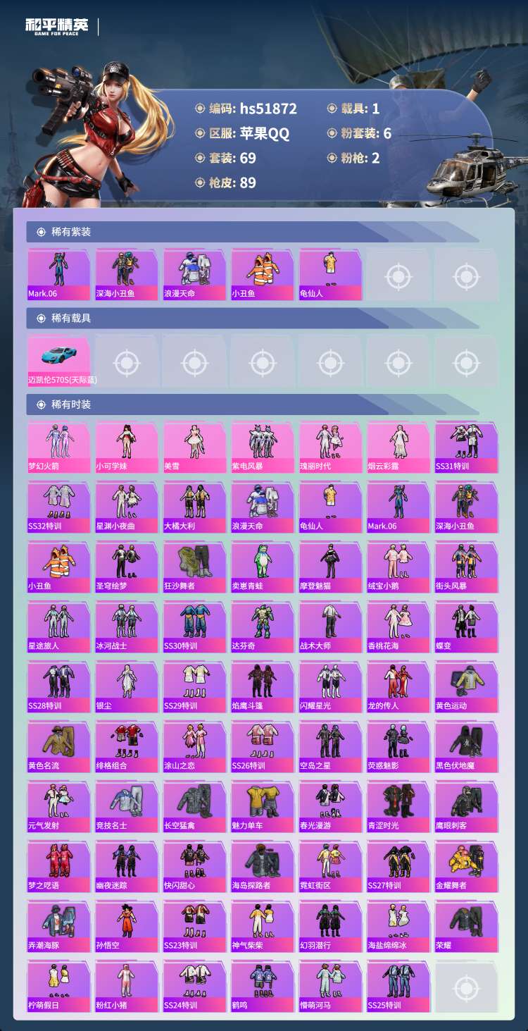 hs51872 苹果手Q-3王牌印记-6粉装-2特效枪-1载具-29638热力值-69套装-89枪皮