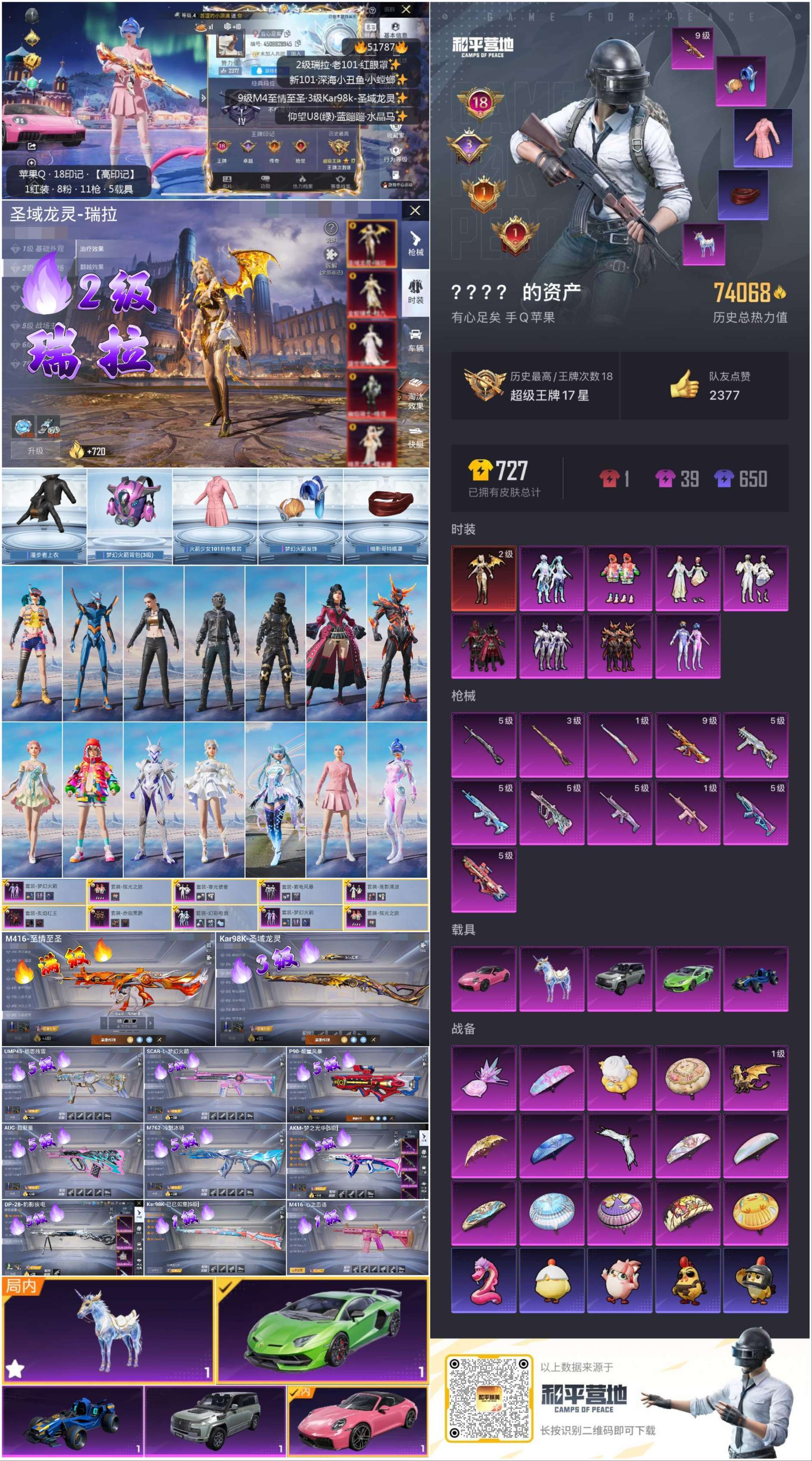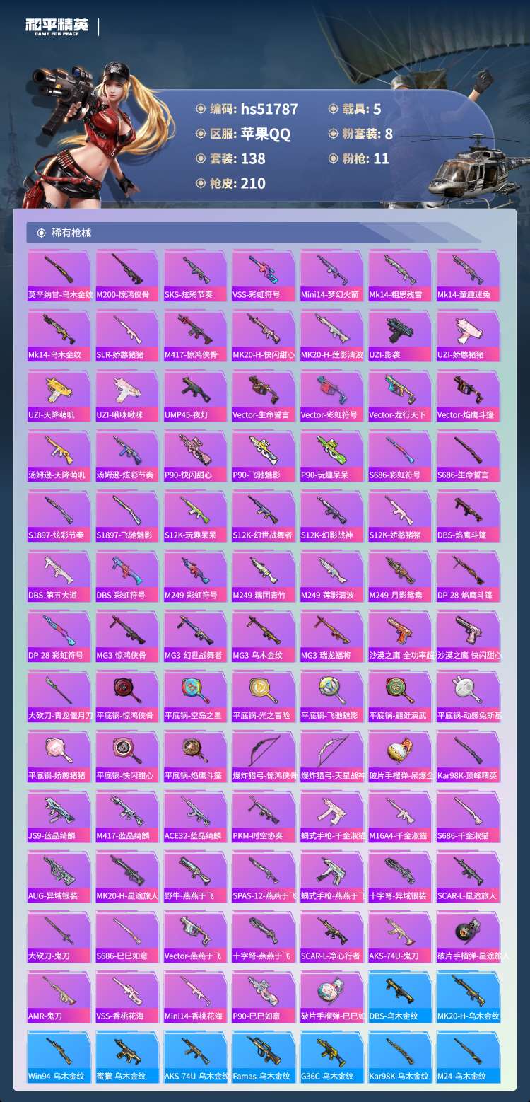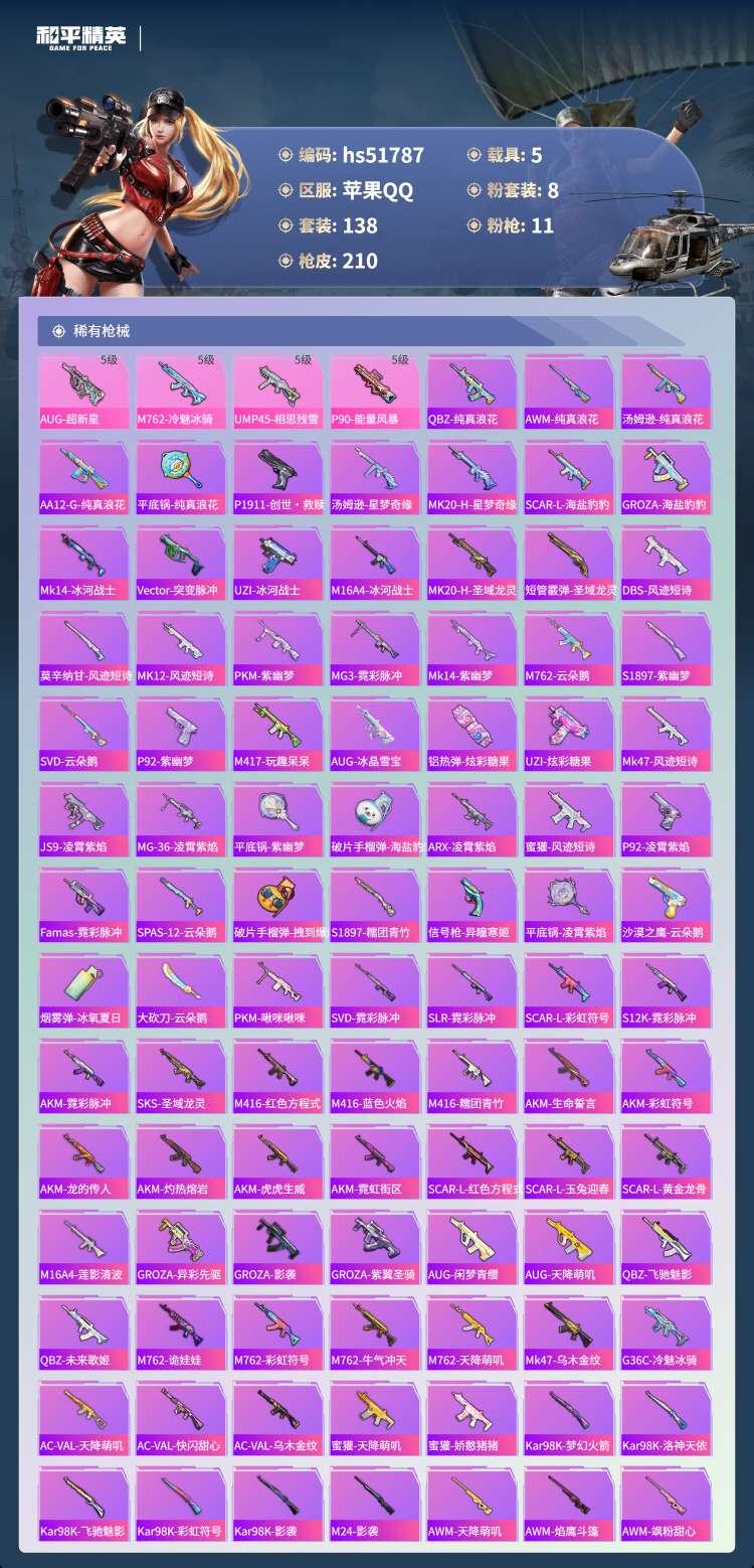hs51787 苹果手Q-18王牌印记-1红装-8粉装-11特效枪-5载具-74068热力值-138