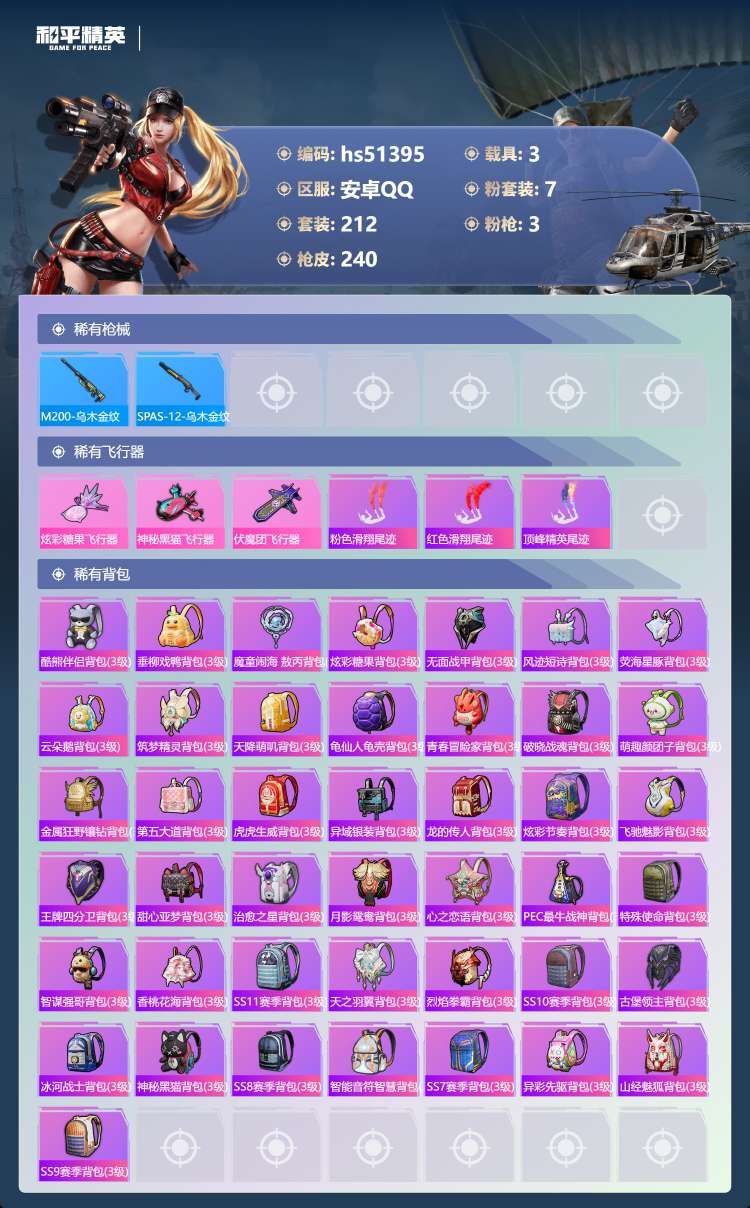 hs51395 安卓手Q-13王牌印记-7粉装-3特效枪-3载具-80042热力值-212套装-24