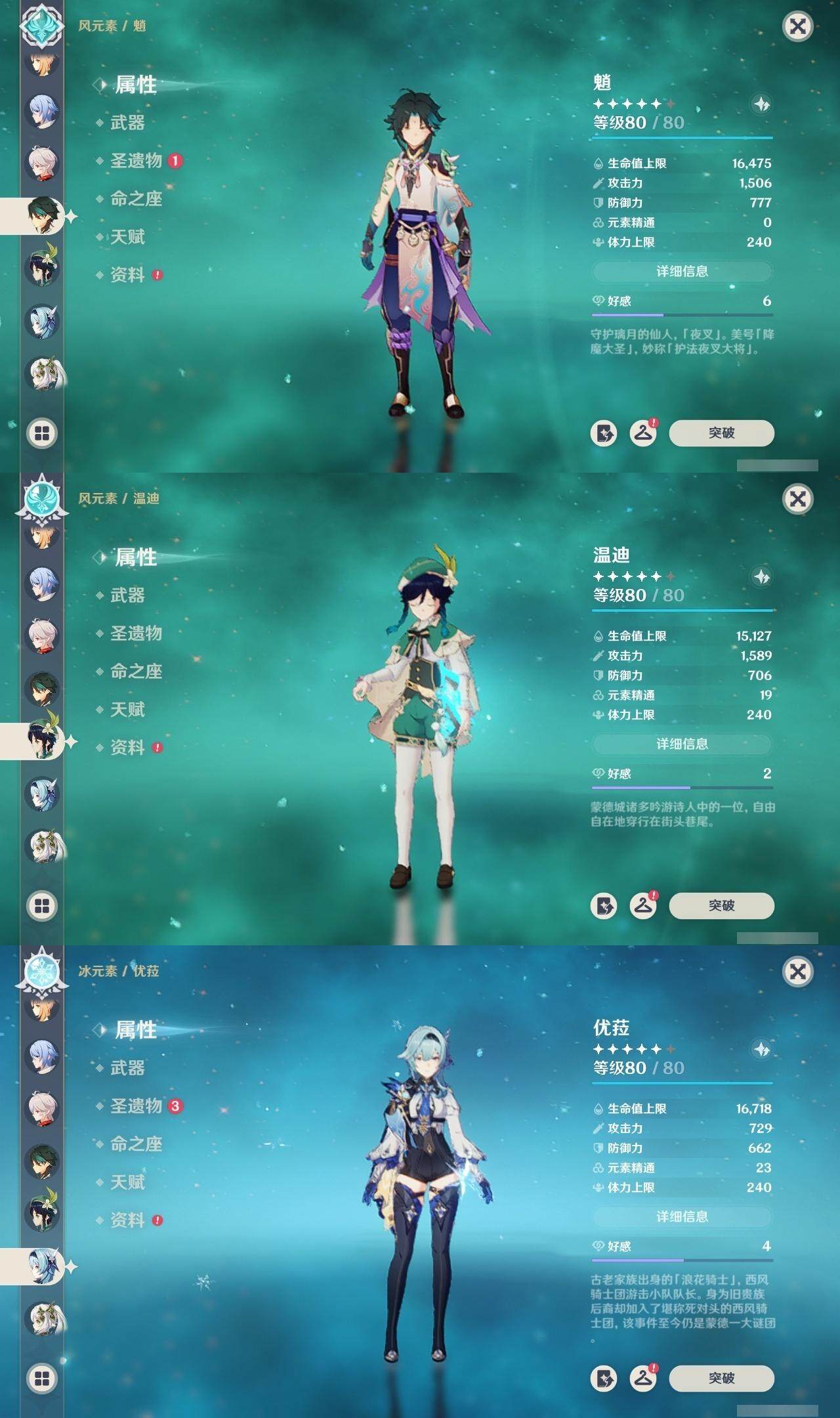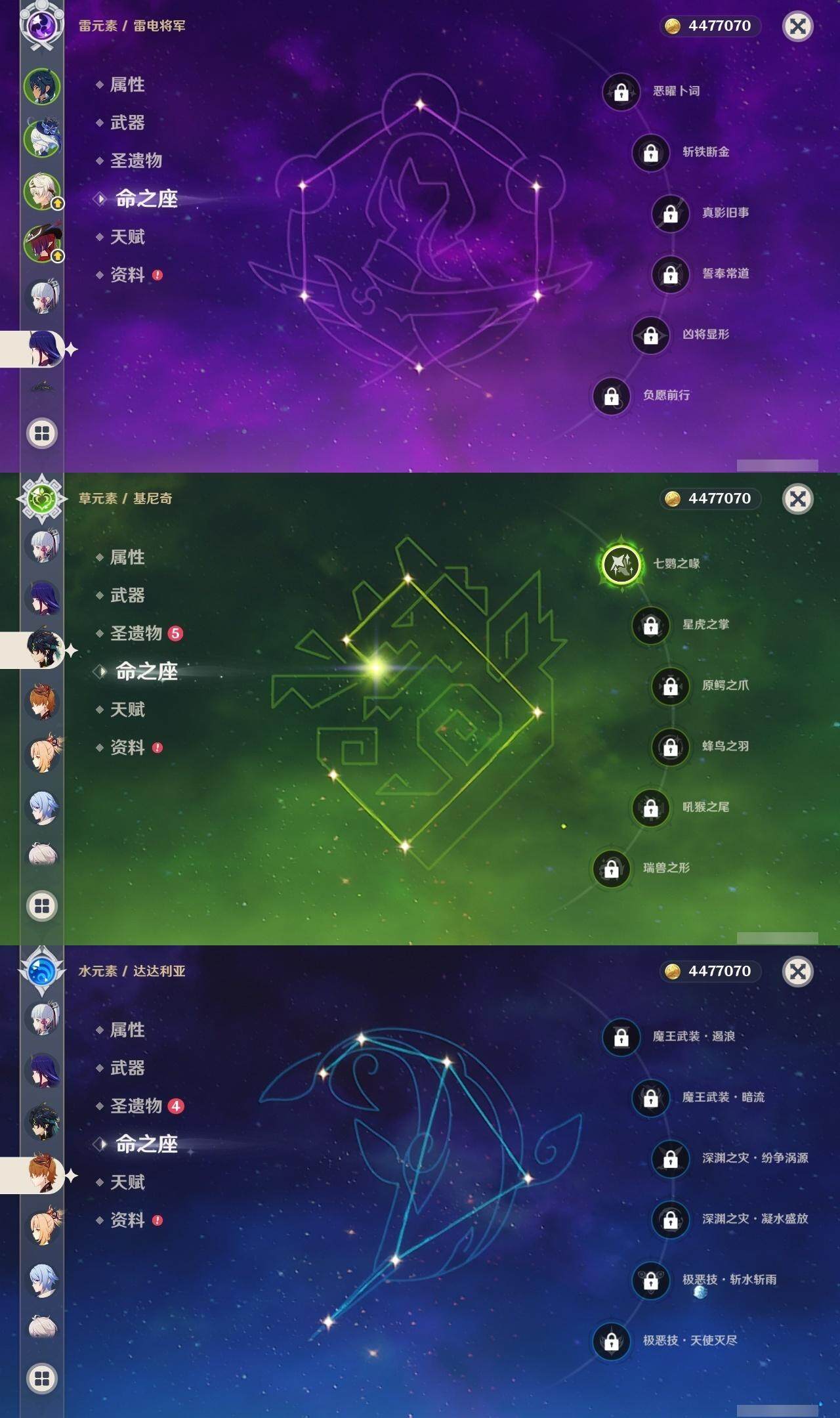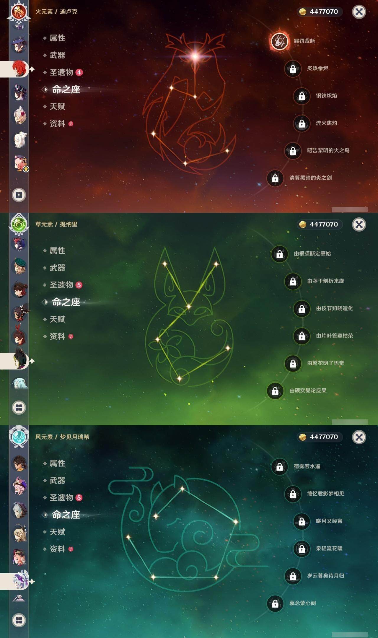 0命芙宁娜,0命纳西妲,0命妮露,0命提纳里,0命神里绫人,0命优菈,0命雷电将军,0命枫原万叶,0命神里绫华,0命魈,0命宵宫,0命温迪,0命可莉,0命达达利亚,2命刻晴,1命琴,3命莫娜,1命迪卢克,1命基尼奇,0命恰斯卡,0命梦见月瑞希,精1有乐御簾切,精1圣显之钥,精1飞雷之弦振,精1苍古自由之誓,精1四风原典,精1天空之脊,精1天空之