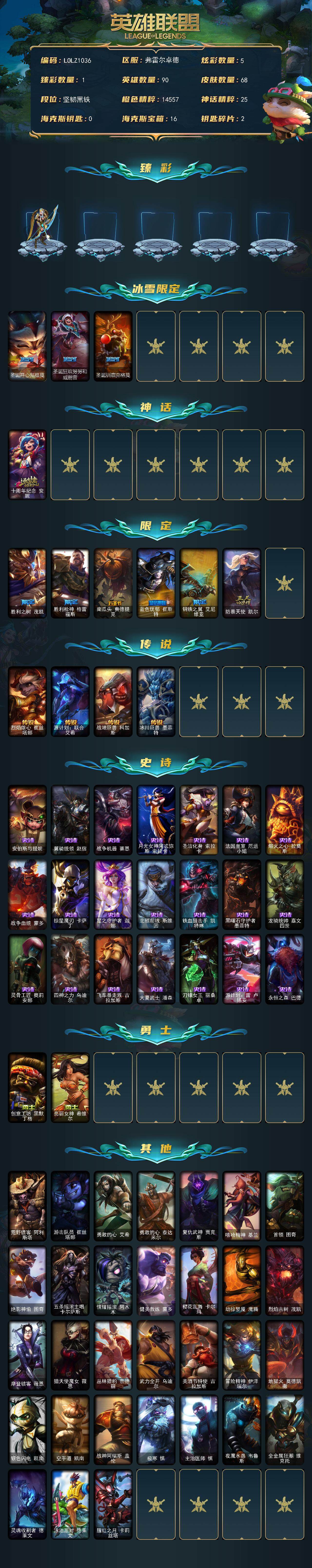 【LOLZ1036】90英雄/68皮肤/1神话/9限定/1臻彩/5炫彩/4传说/21史诗/未定级/冠军之箭艾希凯旋圣装/圣诞开心鬼提莫/圣诞狂欢努努和威朗普/圣诞驯鹿克格莫/十周年纪念安妮/胜利之树茂凯/胜利枪神格雷福斯/南瓜头费德提克/蓝色忧郁崔斯特/钢铁之翼艾尼维亚/防暴天使凯尔/烈焰雄心崔丝塔娜/源计划联合艾希/战地巨兽科加斯/冰川巨兽墨菲特/安伯斯与提妮/翼骑统领赵信/战争机器赛恩/月光女神阿忒弥斯索拉卡/圣洁化身索拉卡/法国皇室厄运小姐/熔火之心拉莫斯/战争血统蒙多/掠星魔刃卡萨丁/星