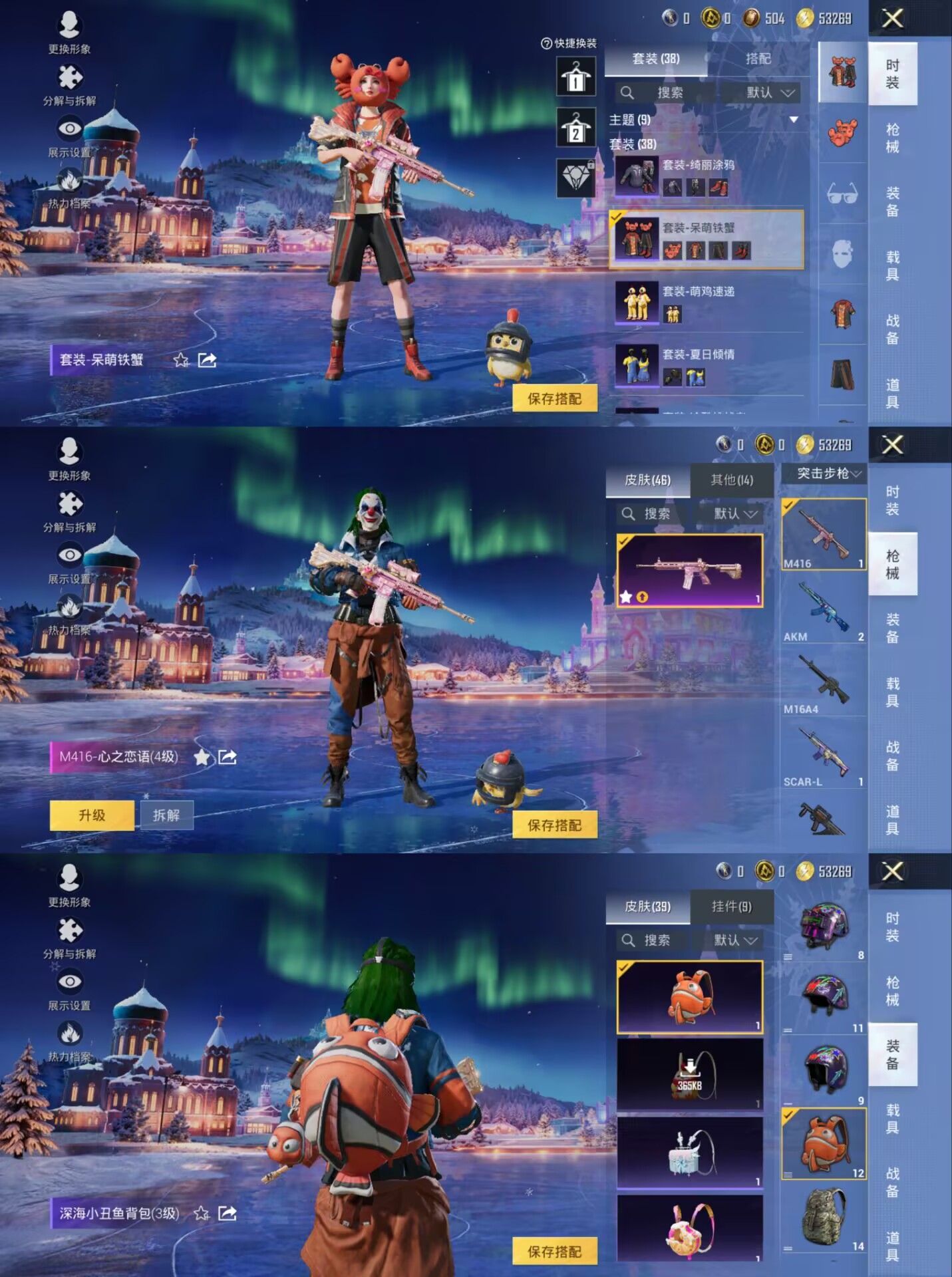 【1粉装3特效 怪诞乔克 心之恋语】安卓Q-1稀有1粉装3特效枪1热门38套装46枪皮 14424热力值 2印记 历史卓越王牌11星 【1稀有】 AKM-缤纷海域 【1粉装】 怪诞乔克 【3特效枪】 M416-心之恋语 (4级) Kar98K-巳巳如意 (5级) DP-28-豹影疾电 (5级) 【1热门】 呆萌铁蟹 【1背包】 深海小丑鱼背包 怪诞乔克 炫彩糖果飞行器 幻彩电音降落伞 M416-