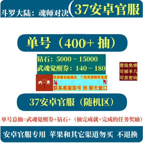 单项资源以账号内数据为主/相差不超标题描述5%,单号总抽:钻石+武魂觉醒券+抽完领;支线+领成就;.苹果专用,随机区服,随机死绑活绑,部分游戏邮箱已随机实铭!无法提供信息,介意勿拍!!【小手点收藏,带你不迷航!】