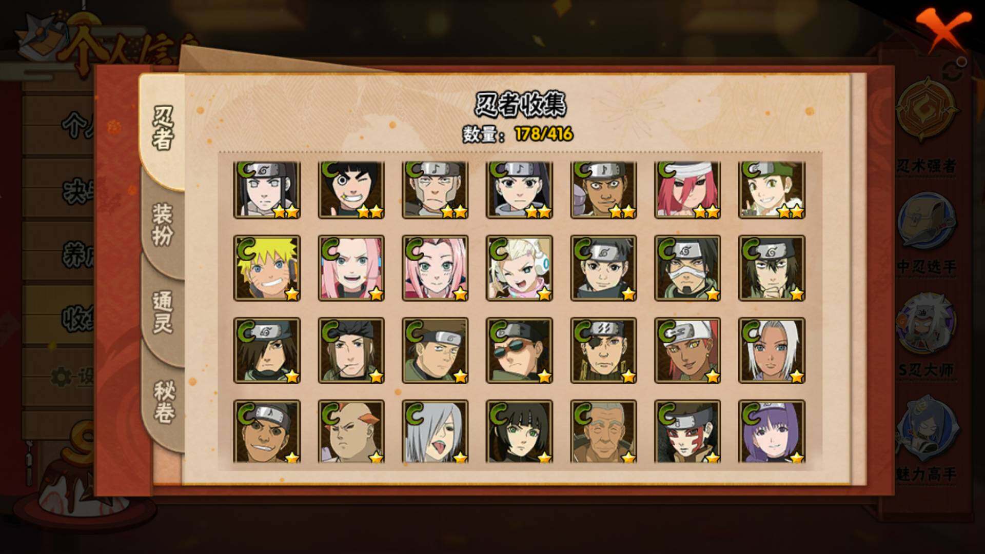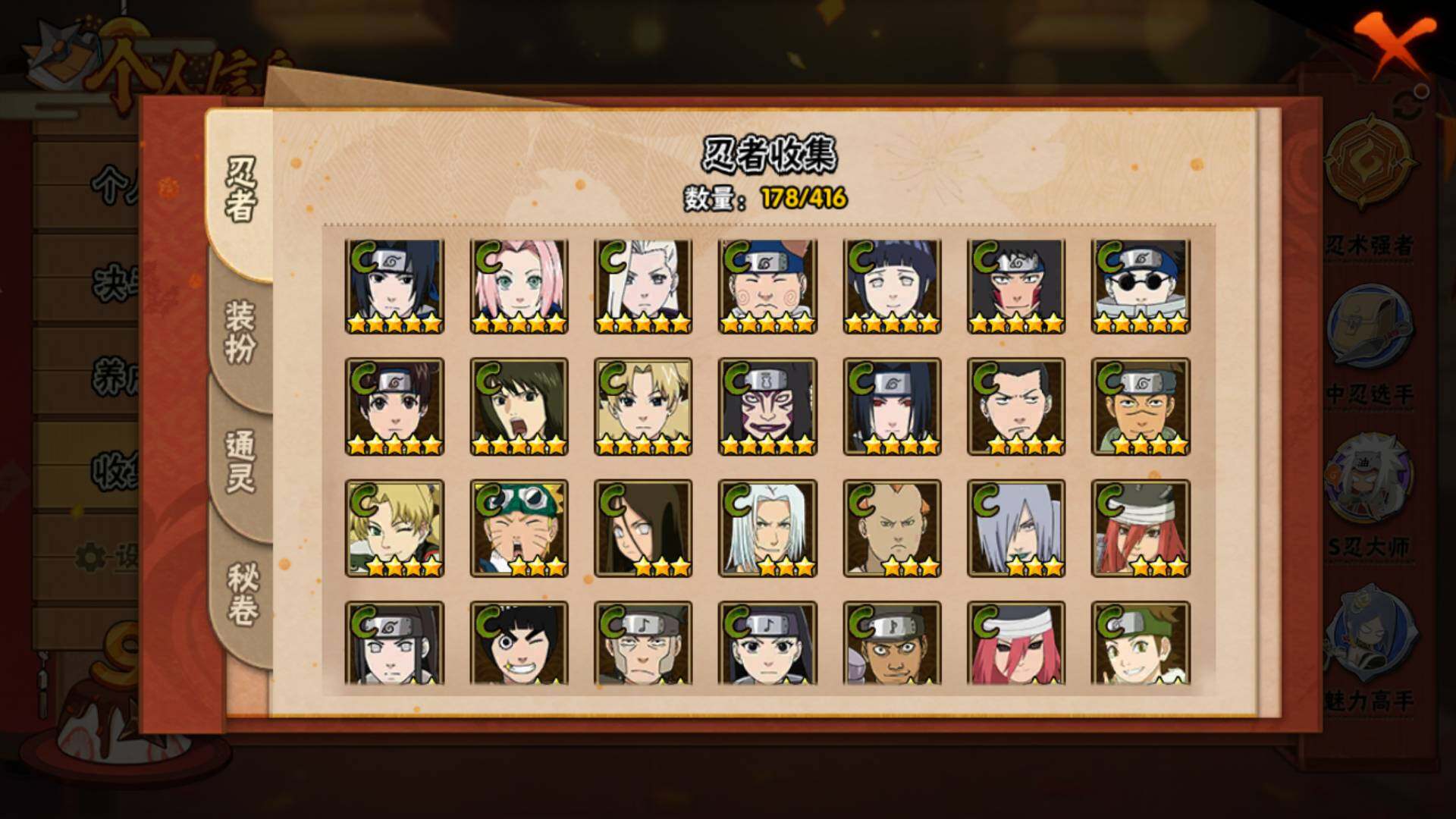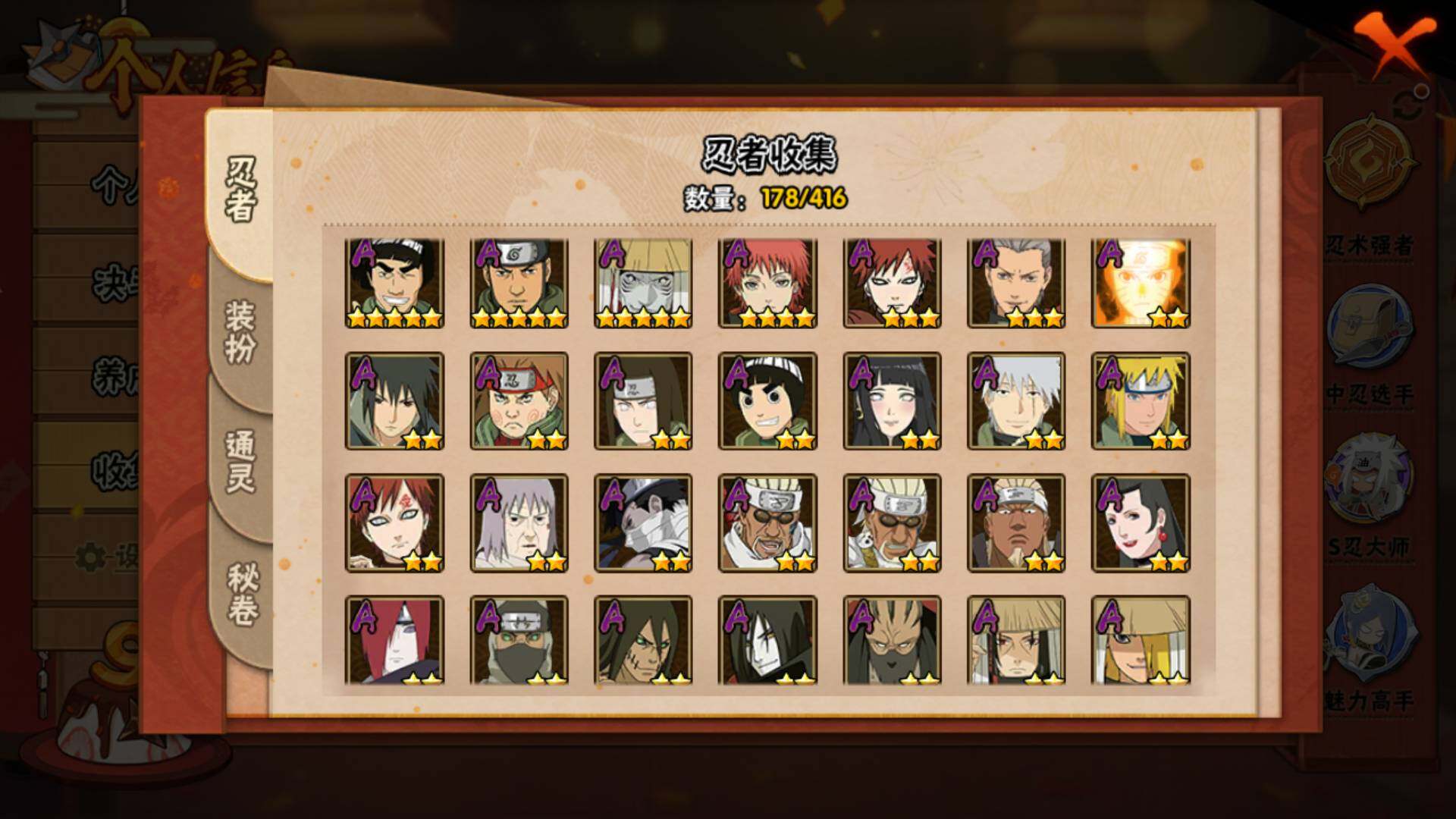 【S级忍者】:波风水门「秽土转生」(3星),千手柱间「秽土转生」(3星),宇智波斑「秽土转生·解」(3星),大野木「忍界大战」(3星),宇智波带土「忍界大战」(3星),艾「忍界大战」(3星),宇智波鼬「须佐能乎」(3星),旗木卡卡西「须佐能乎」(3星),千手柱间「木叶创立」(3星),自来也(3星),自来也