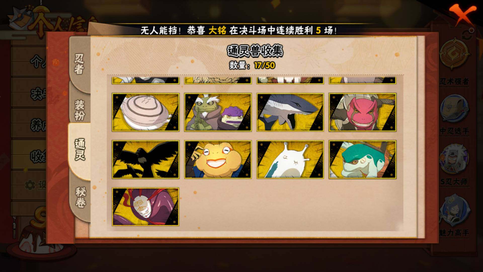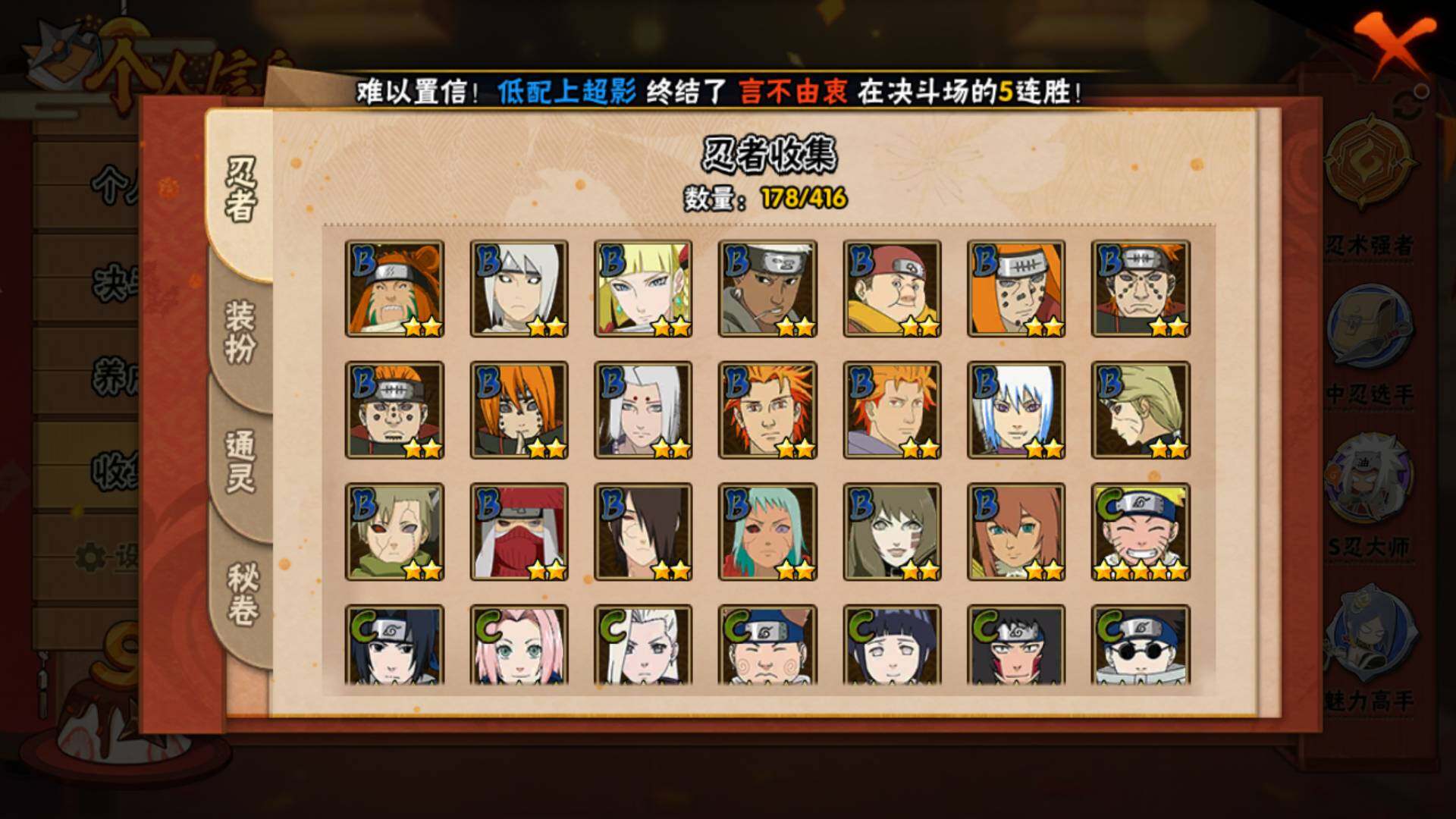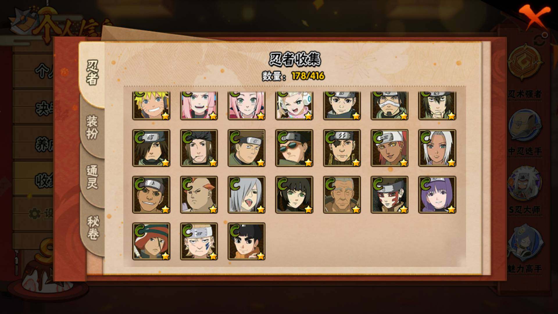 【S级忍者】:波风水门「秽土转生」(3星),千手柱间「秽土转生」(3星),宇智波斑「秽土转生·解」(3星),大野木「忍界大战」(3星),宇智波带土「忍界大战」(3星),艾「忍界大战」(3星),宇智波鼬「须佐能乎」(3星),旗木卡卡西「须佐能乎」(3星),千手柱间「木叶创立」(3星),自来也(3星),自来也