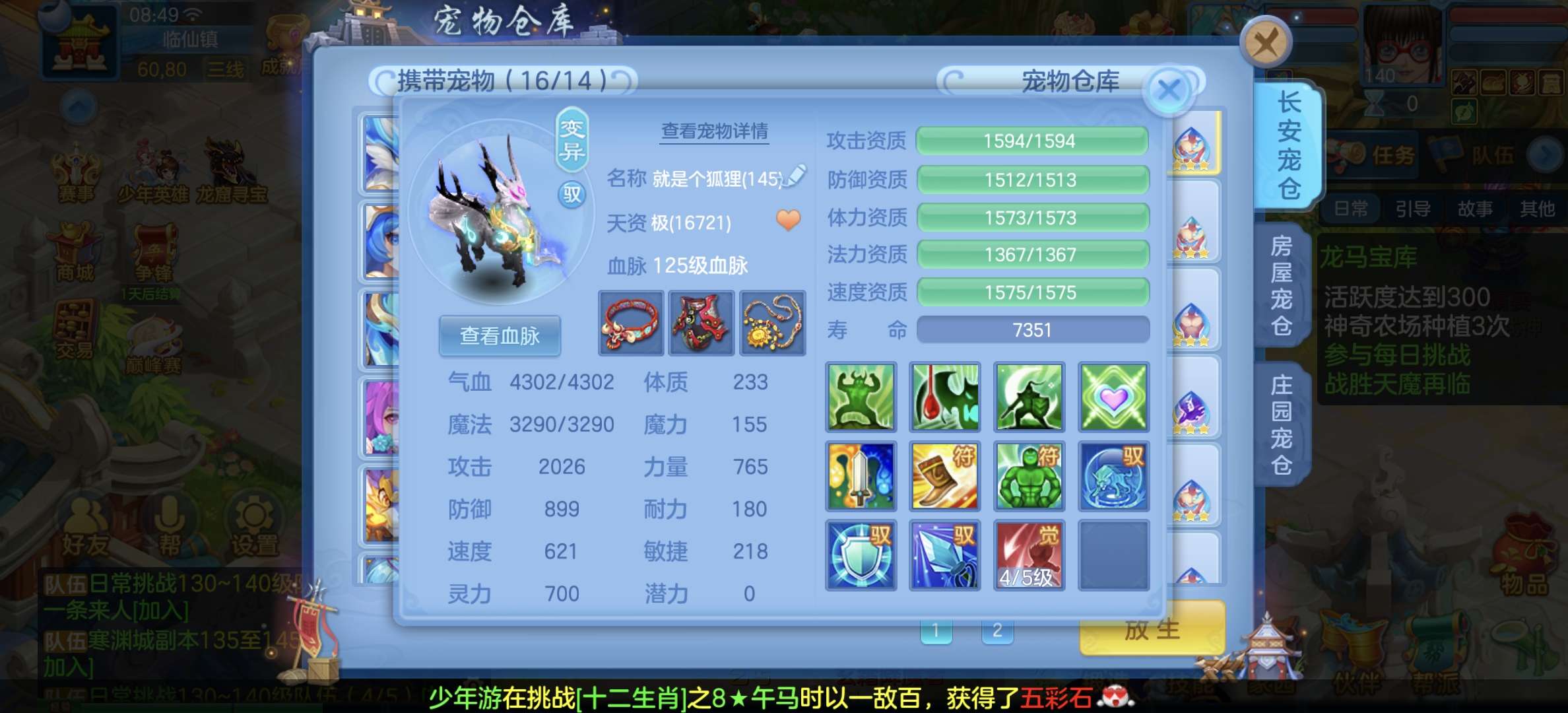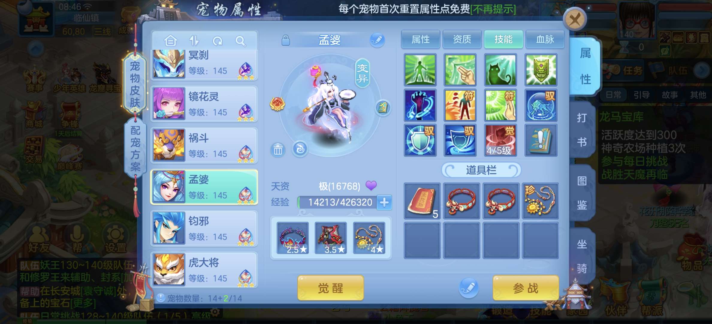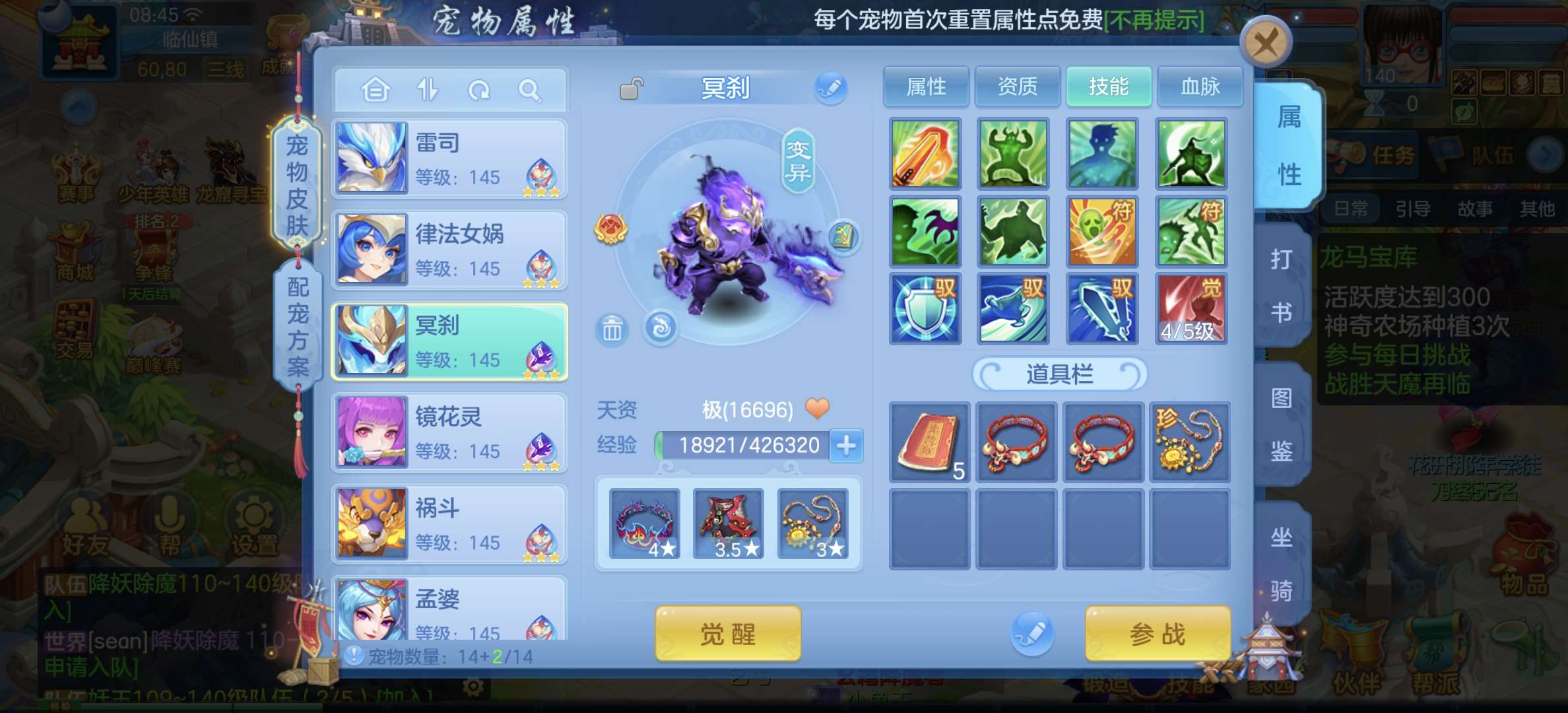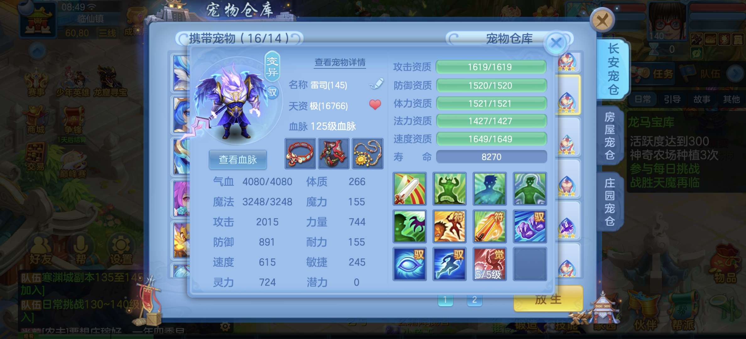8个宠物天赋,33只宝宝任意搭配不同战斗,装备特技齐全,仓库配备不同职业的高端装备,专职一样极品!