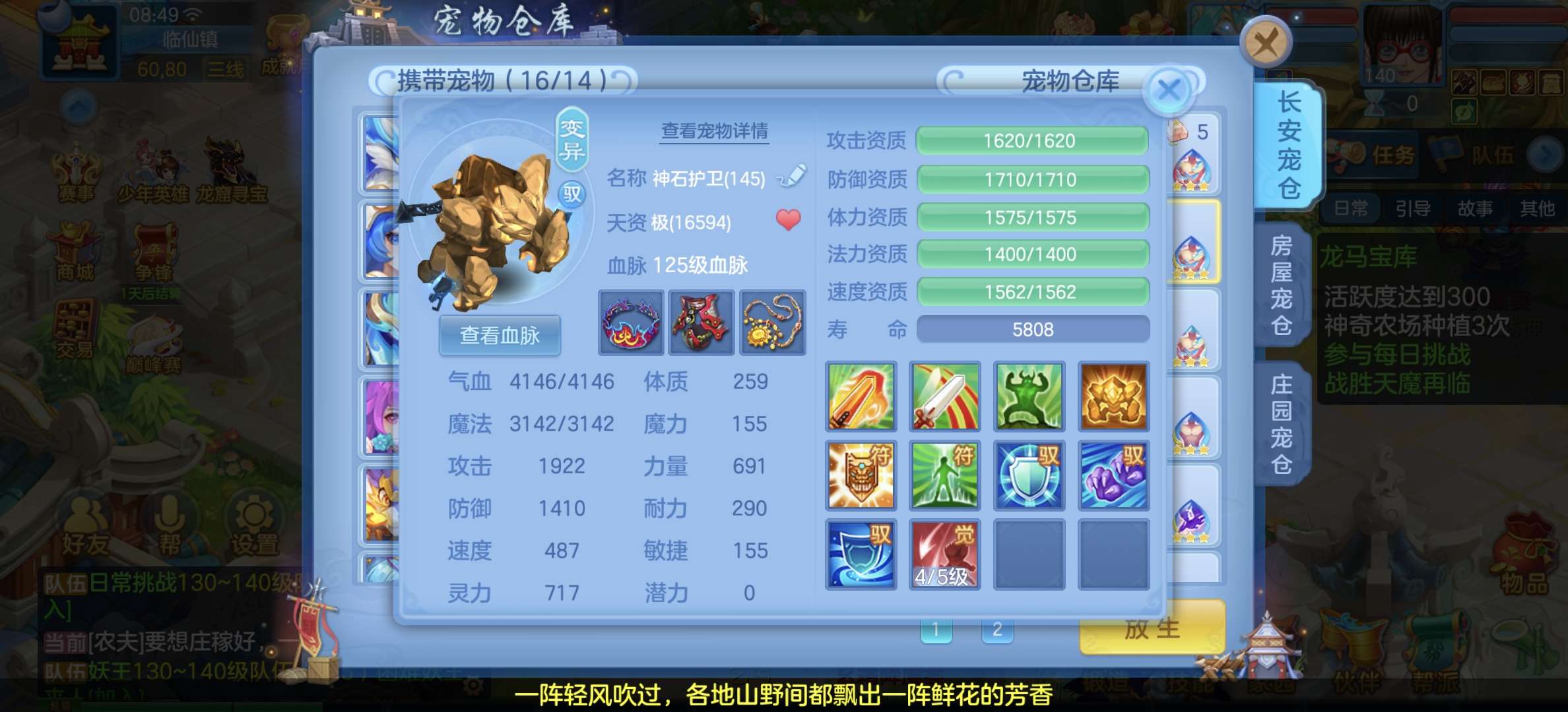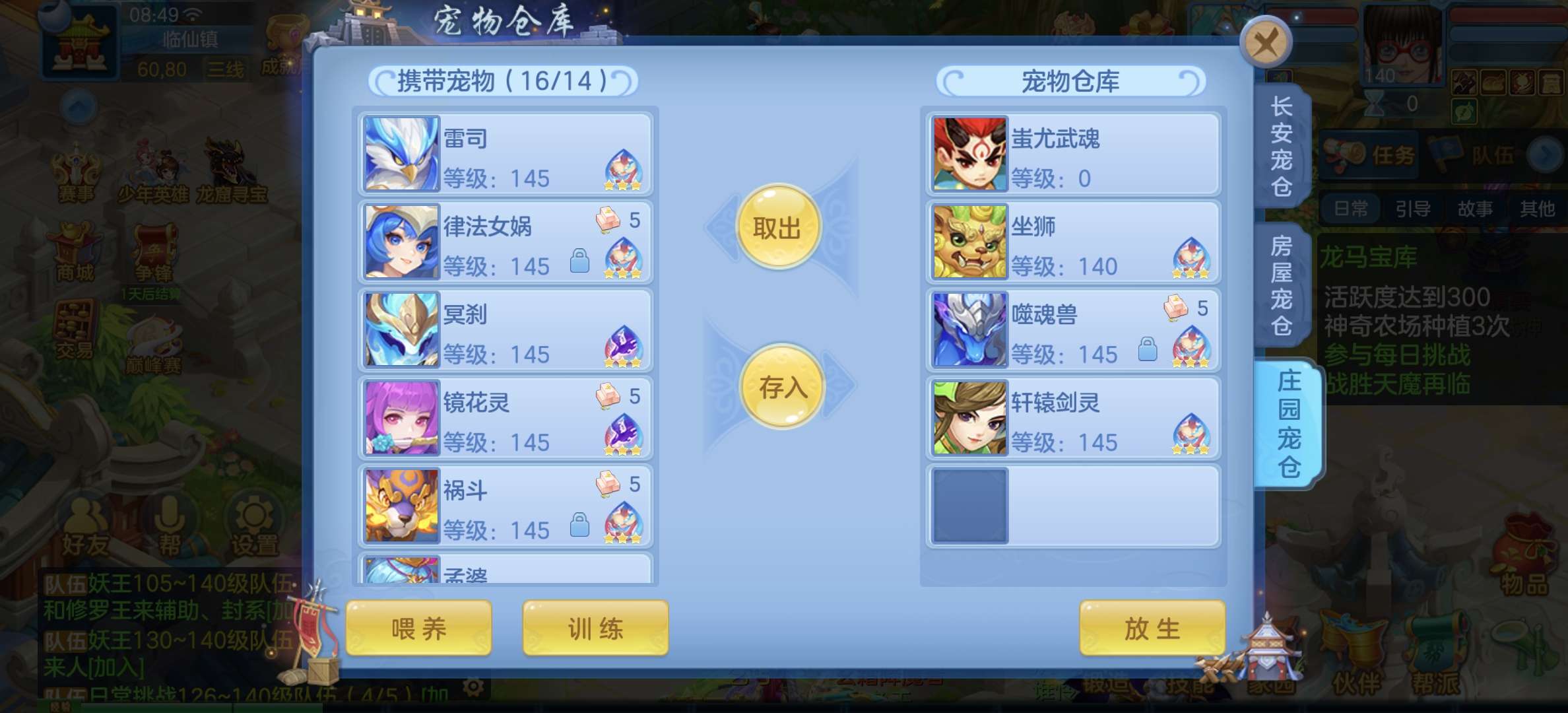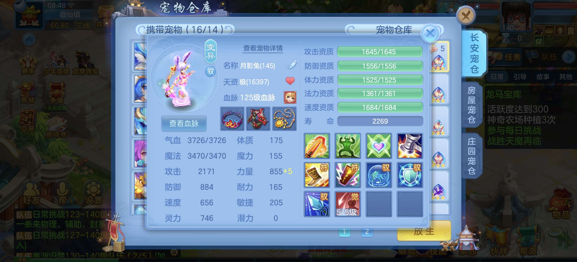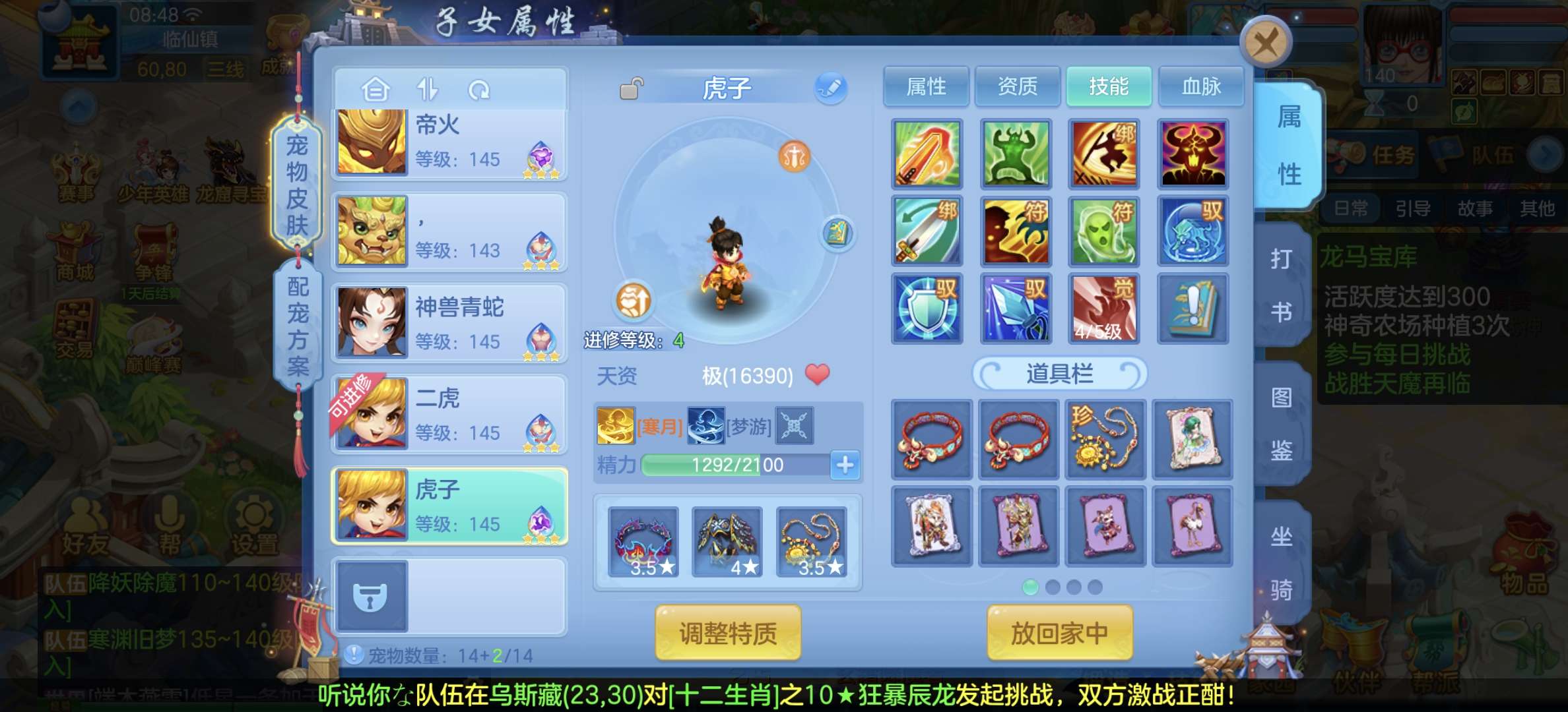 8个宠物天赋,33只宝宝任意搭配不同战斗,装备特技齐全,仓库配备不同职业的高端装备,专职一样极品!