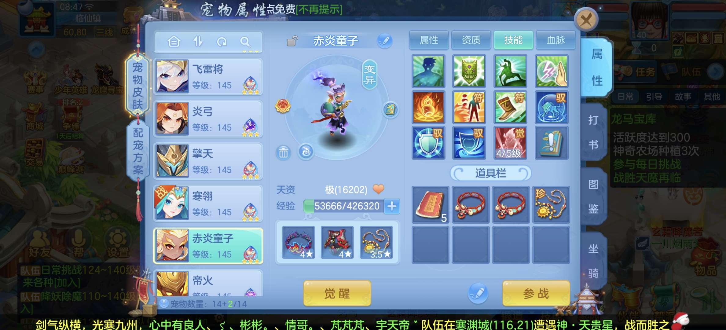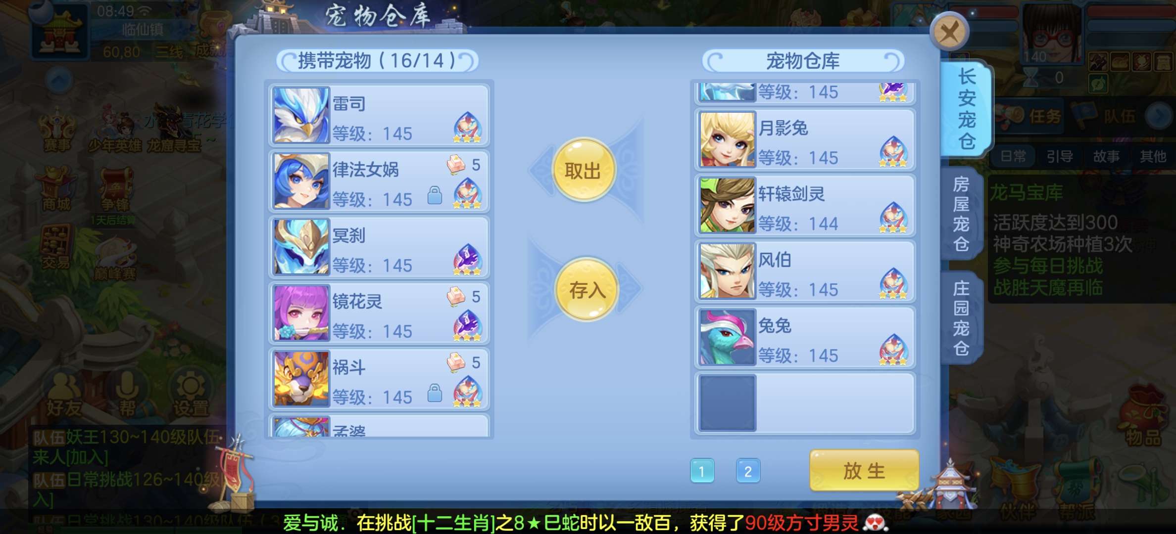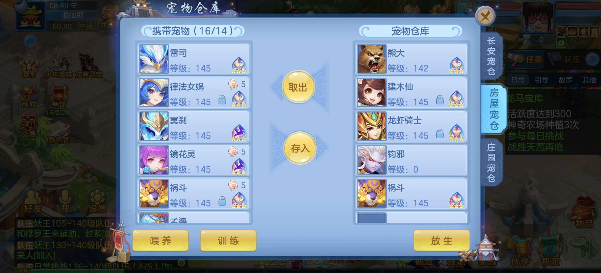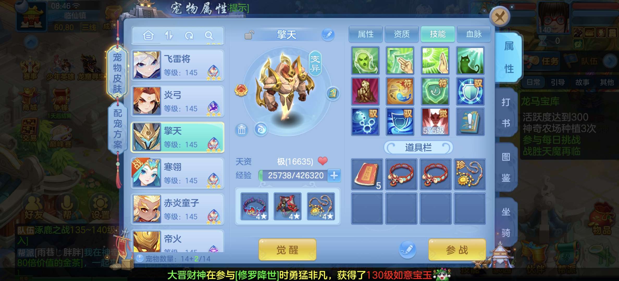 8个宠物天赋,33只宝宝任意搭配不同战斗,装备特技齐全,仓库配备不同职业的高端装备,专职一样极品!