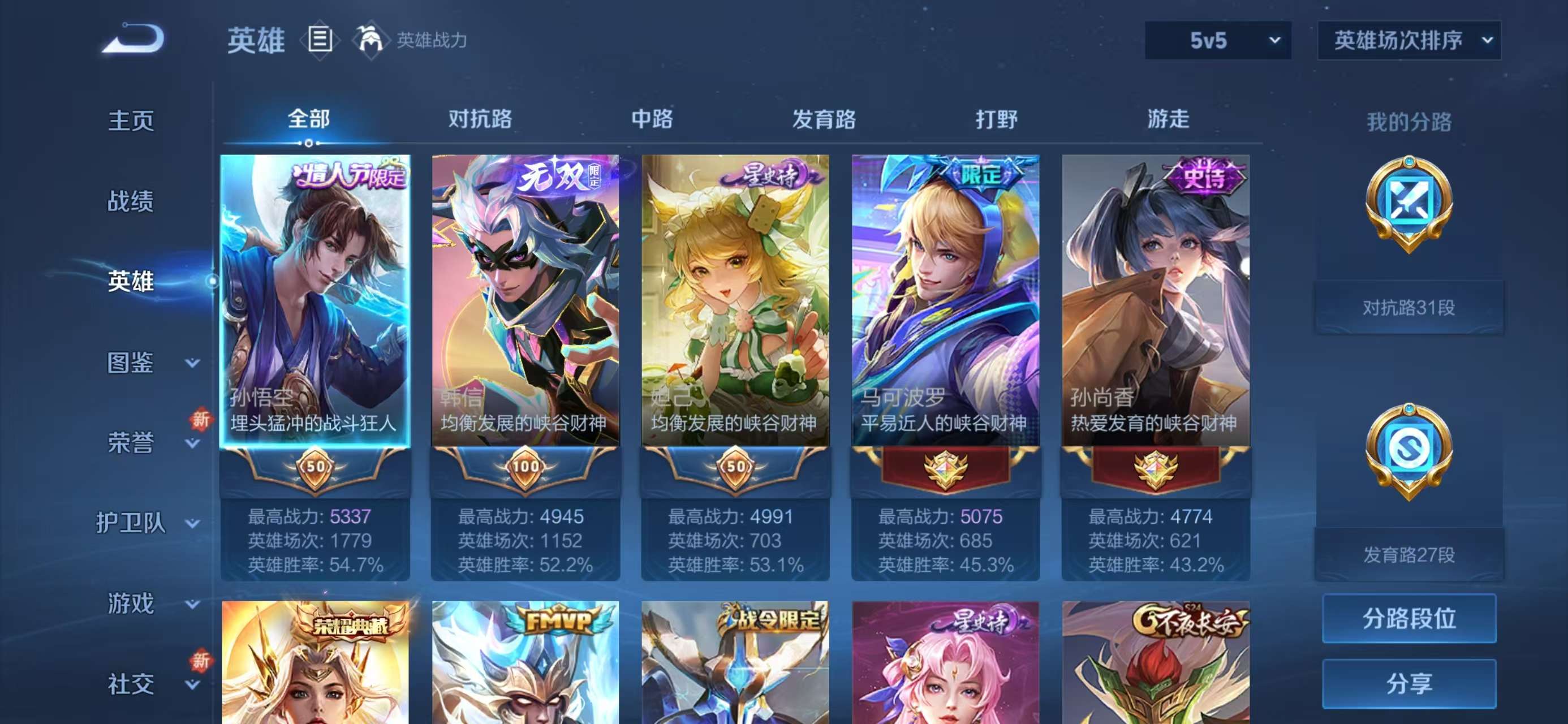 安卓QQ/荣耀王者/279皮肤/124英雄/1典藏/0珍品无双/1无双/0珍品传说/8传说/75史诗