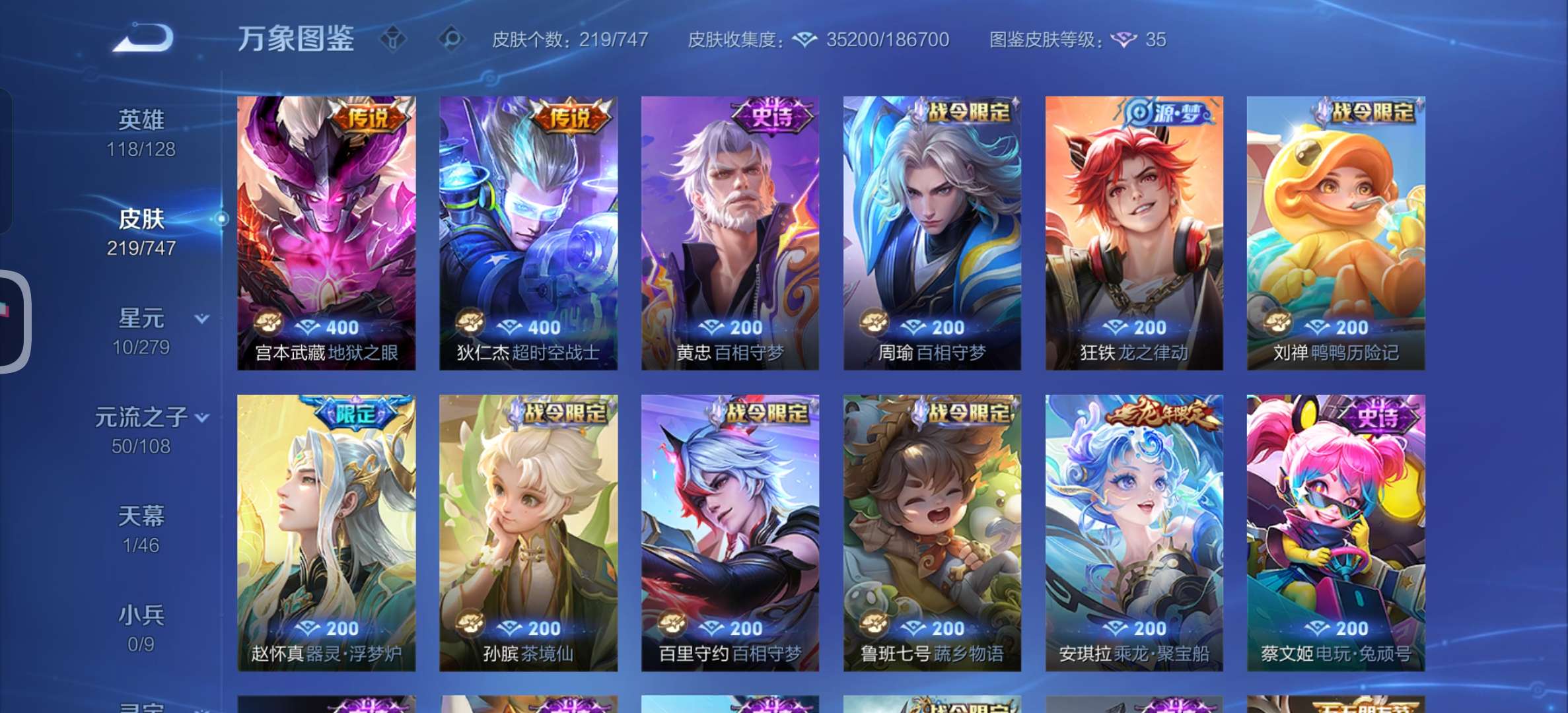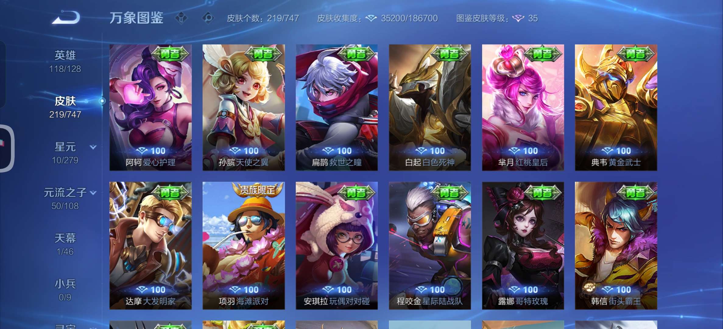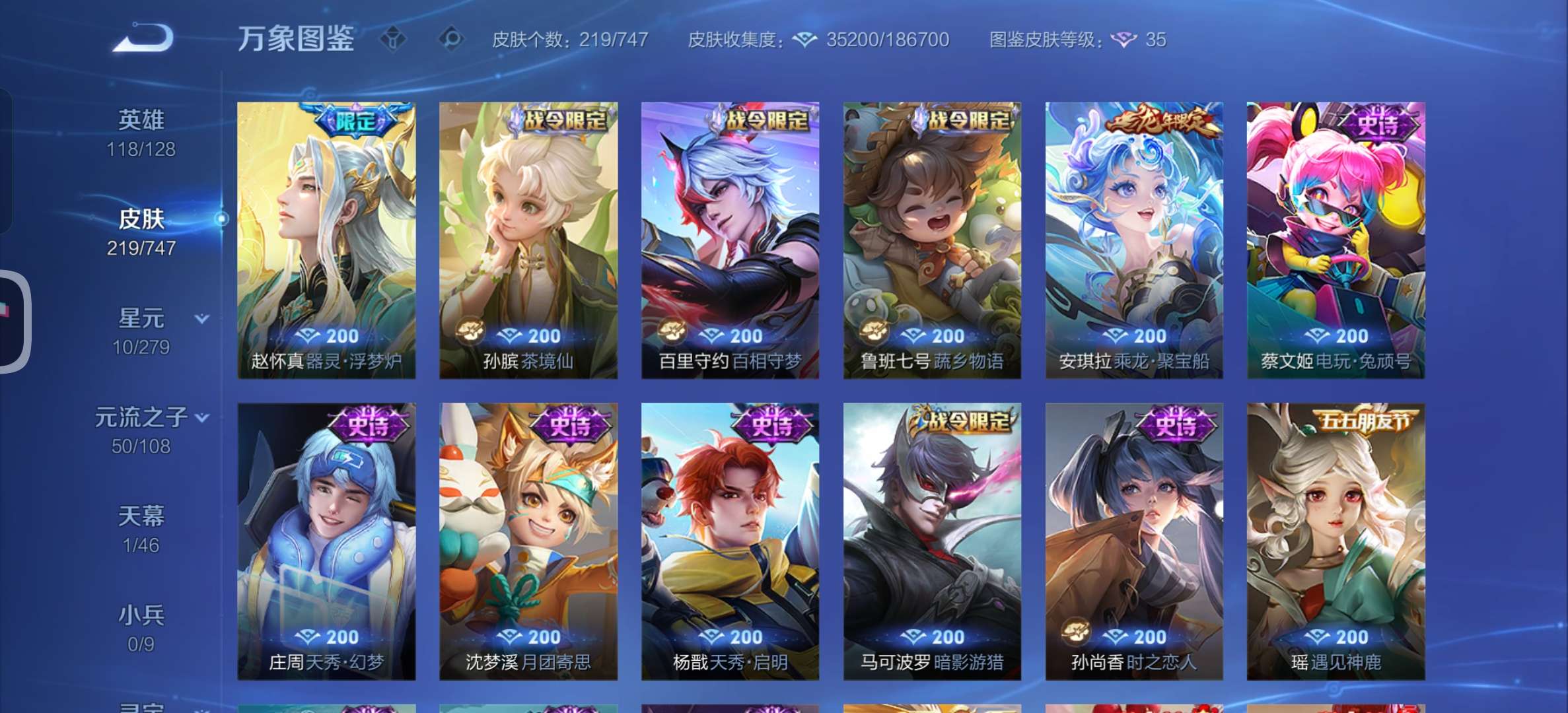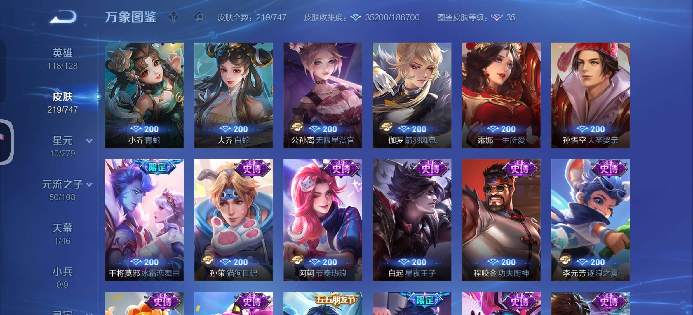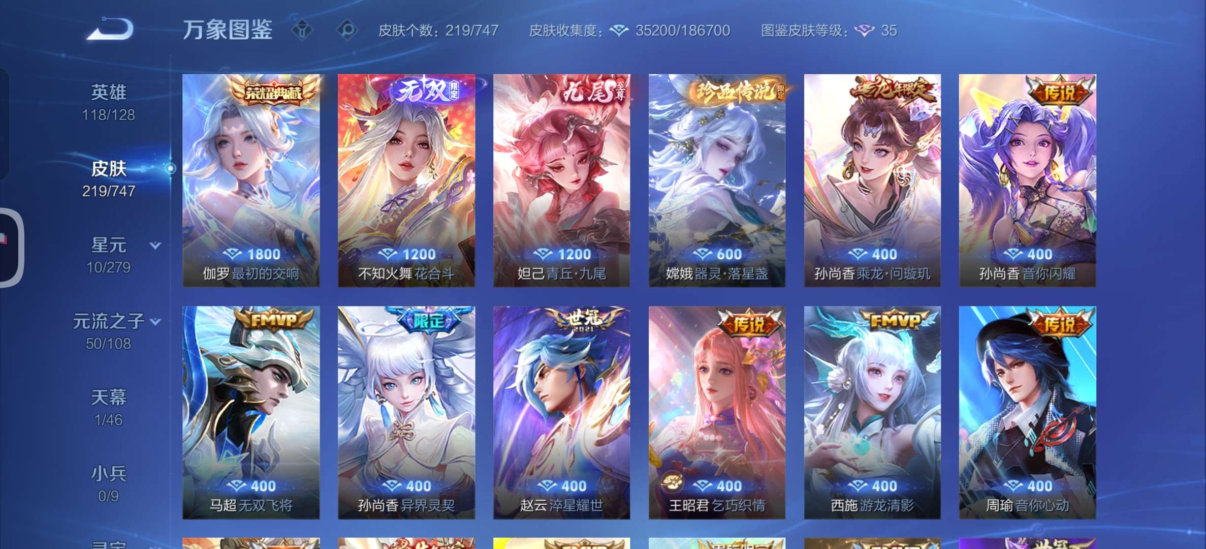 安卓QQ-1典藏-22传说-2无双-219皮肤-118英雄-至尊星耀-王者号贵九女生一手号有很多传说