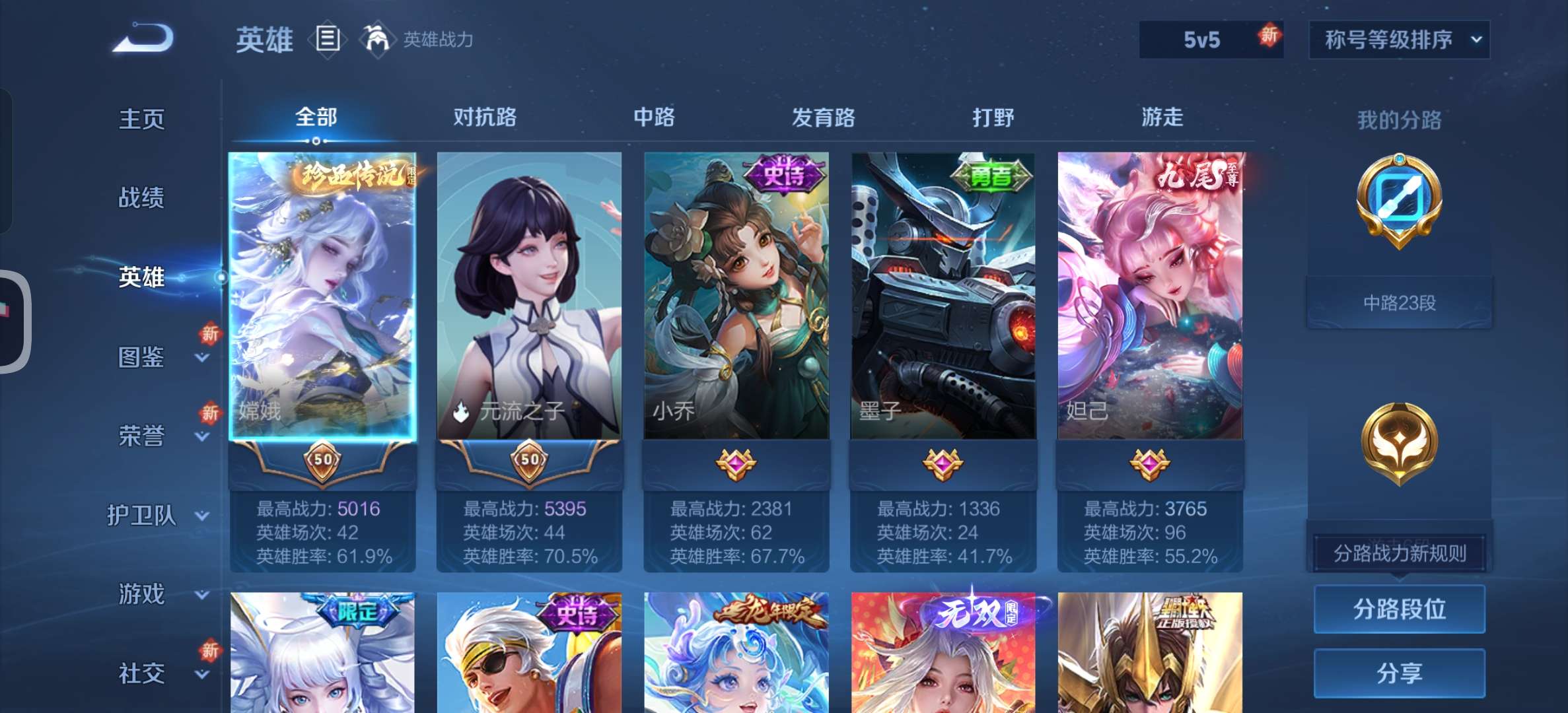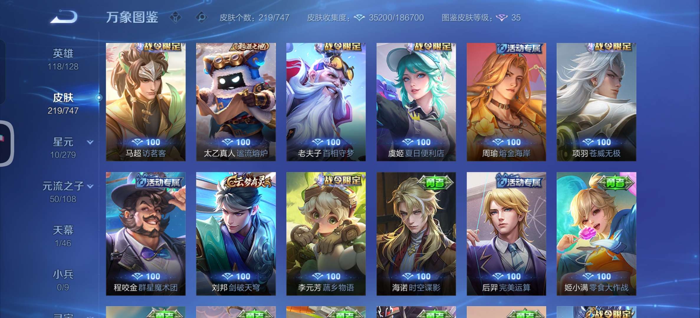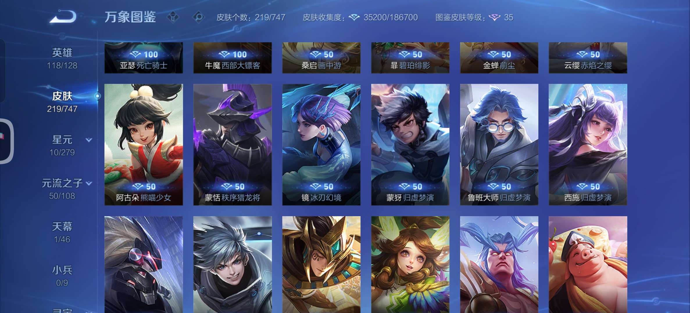 王者号贵九女生一手号不想玩了,有很多传说皮,还有火舞和妲己无双限定,还有伽罗荣耀典藏